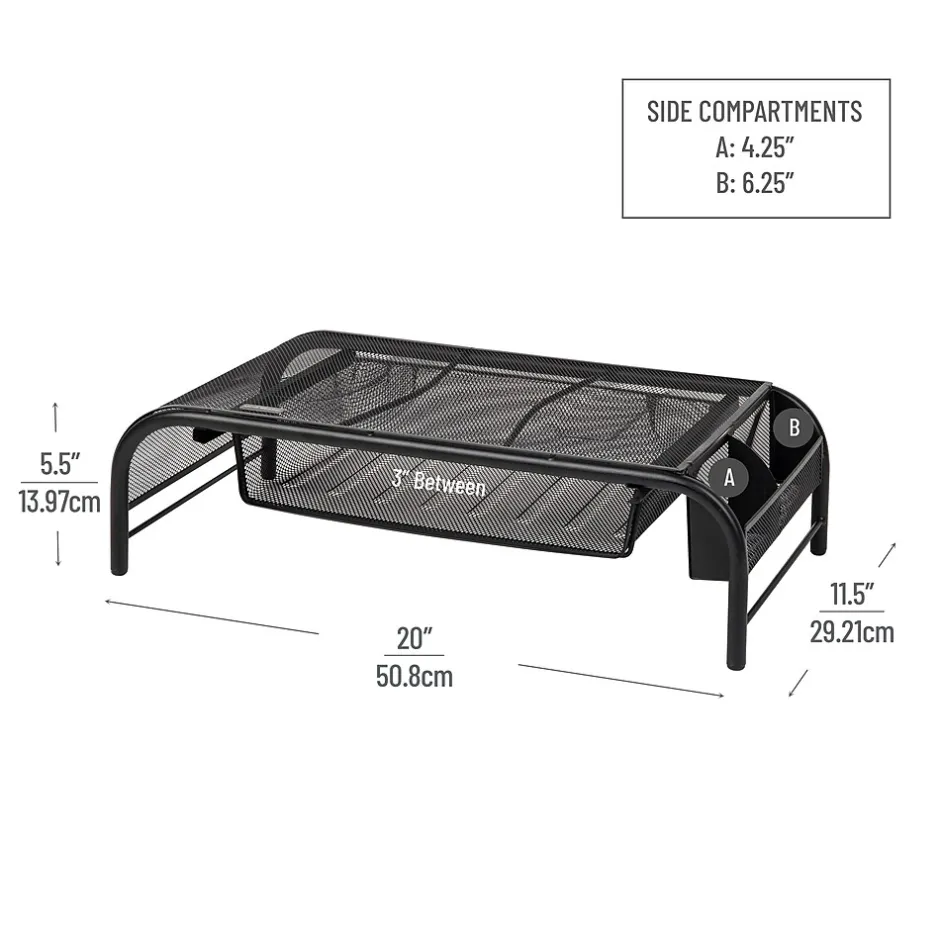 Work more comfortably and efficiently with this monitor stand, designed to keep your computer monitor, laptop, or tablet at the optimal height for an improved viewing angle. By promoting a more ergonomic posture, this stand reduces strain on the neck, shoulders, and joints, especially over long periods of working or studying.The stand also doubles up as a desktop organizer, helping clear up and manage your workspace. It features two storage compartments on the side for pens, markers, and other office supplies. Papers and files can be neatly tucked away in the lower tier, while there’s ample space under the stand to store your keyboard when not in use.Constructed from sturdy mesh metal, this stand can comfortably support the weight of most standard monitors and laptops. To prevent slipping, the monitor stand’s feet have rubber grips for added stability.The compact design makes it a great gift for anyone who spends a significant amount of time in front of a screen. Whether you’re a student heading off to college, studying at home, or a professional working in a home office, this monitor stand and organizer enhances comfort and efficiency.