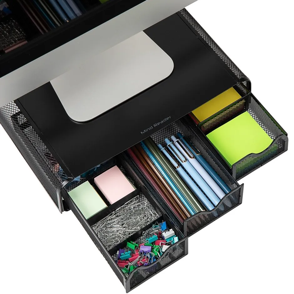 Experience the benefits of an ergonomic monitor stand designed to improve posture, reduce neck and shoulder pain, and elevate your monitor to a comfortable eye level for optimal viewing. This monitor stand not only helps reduce muscle and neck strain but also frees up valuable desk space for increased productivity.Featuring rubber feet for stability and an attractive design, this stand includes a built-in desk organizer with three drawers, offering ample storage for office supplies. Made from high-quality metal mesh, it is strong, durable, and easy to clean for daily use.Measuring 13.25 x 12.5 x 3 inches and weighing 5.5 lbs, this monitor stand can hold a variety of monitor sizes and weights up to 22 lbs. Easily movable and versatile, it makes a great gift for students, those with small spaces, or people who enjoy traveling. Complete your workspace with other Network Collection products for a cohesive, organized look.