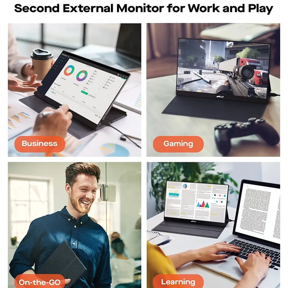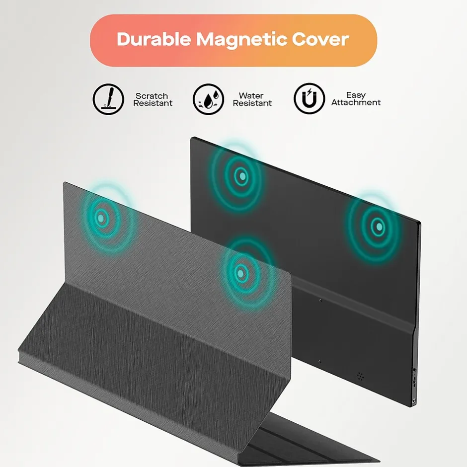 Easily add a second monitor for working from home. The Fold 15.6-In. Monitor from Mobile Pixels Inc. boosts your productivity. As a portable external monitor, Fold accommodates every travel scenario. It is a truly portable computer monitor for writers, students, gamers, field engineers, and more. It supports Plug and Play with DP-enabled USB-C devices, meaning no driver installation is required. It has up to 1920 x 1080 resolution, advanced IPS glossy screen support, a 178° full viewing angle, and it renders accurate and crystal clear images. See video content in an immersive experience with incredible detail. Built-in eye care mode effectively reduces blue light for long-term eye comfort. Easily get a second monitor for working from home. Get built-in 2 Type-C ports with an additional mini HDMI for wide compatibility. Only 1 USB-C cable is required to connect to the power supply and display signal transmission with DP ALT-MODE-enabled devices. The Fold has full compatibility with HDMI-enabled devices like laptops, Samsung DeX, PS5/PS4, Xbox, and Switch. The Fold portable external monitor comes with a Folio case that works as a kickstand as well as a protective sleeve. The scratchproof smart cover is made of durable PU leather and can outlast the life of the device.