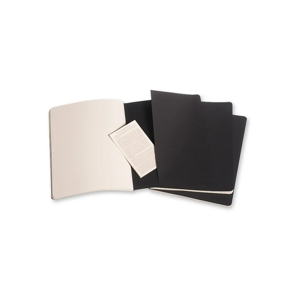 Jot down lists, ideas, and other notes with these extra-large black soft cover ruled journals. The soft covers and compact size make it easy to store these journals in a purse or backpack, while the black coloring adds a sophisticated appearance. These Moleskine Cahier soft cover journals come in a set of three and have lightly printed ruling to guide writing while ensuring words stand out for easy readability.