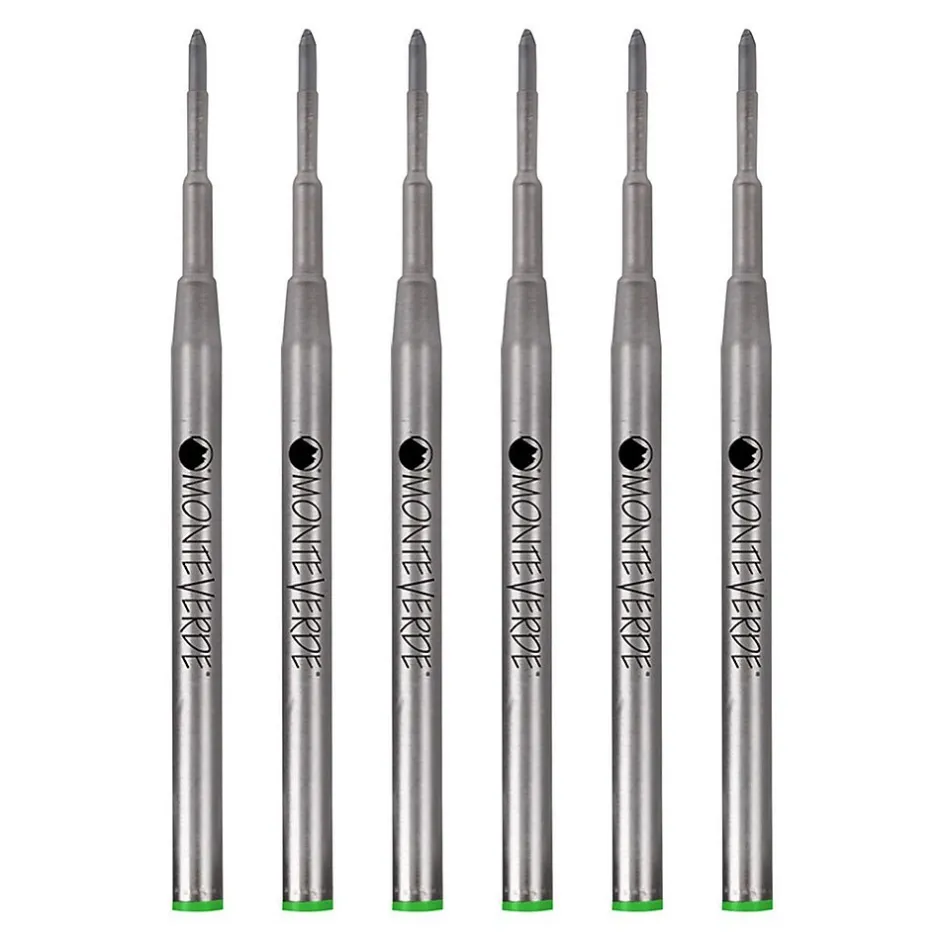 Monteverde® Soft roll™ Ballpoint refill in green for Montblanc® pens has low viscosity ink for easy flow in large capacity metal body for long writing. Refill bears a nickel plated brass tube and a medium point swiss tip, sold as 6 per pack.