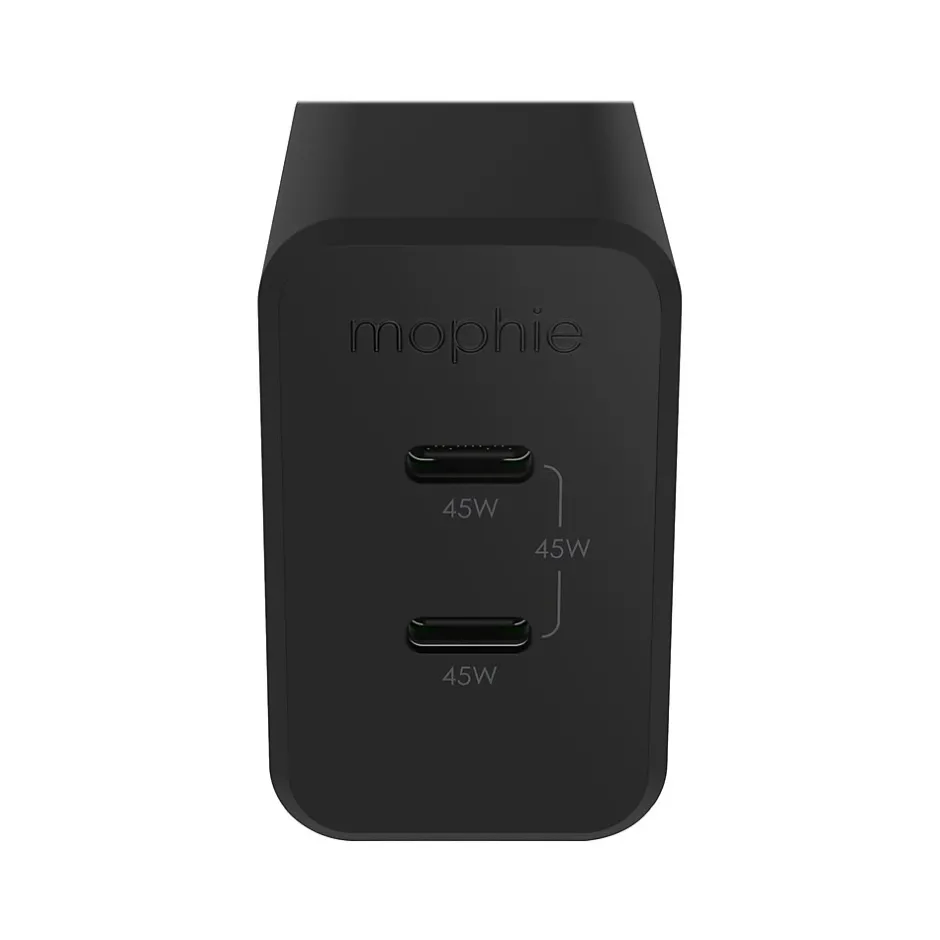 Charge faster! The Mophie speedport 45 delivers a maximum shared output of up to 45W to your phone, tablet, and other digital devices. With two USB-C ports, you can charge two devices at once. GaN technology increases charging efficiency and speed, so you get a lot of power in an ultra-compact package.