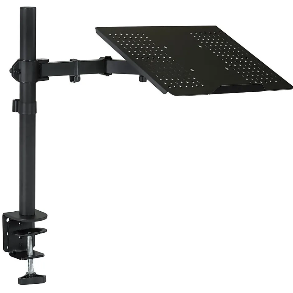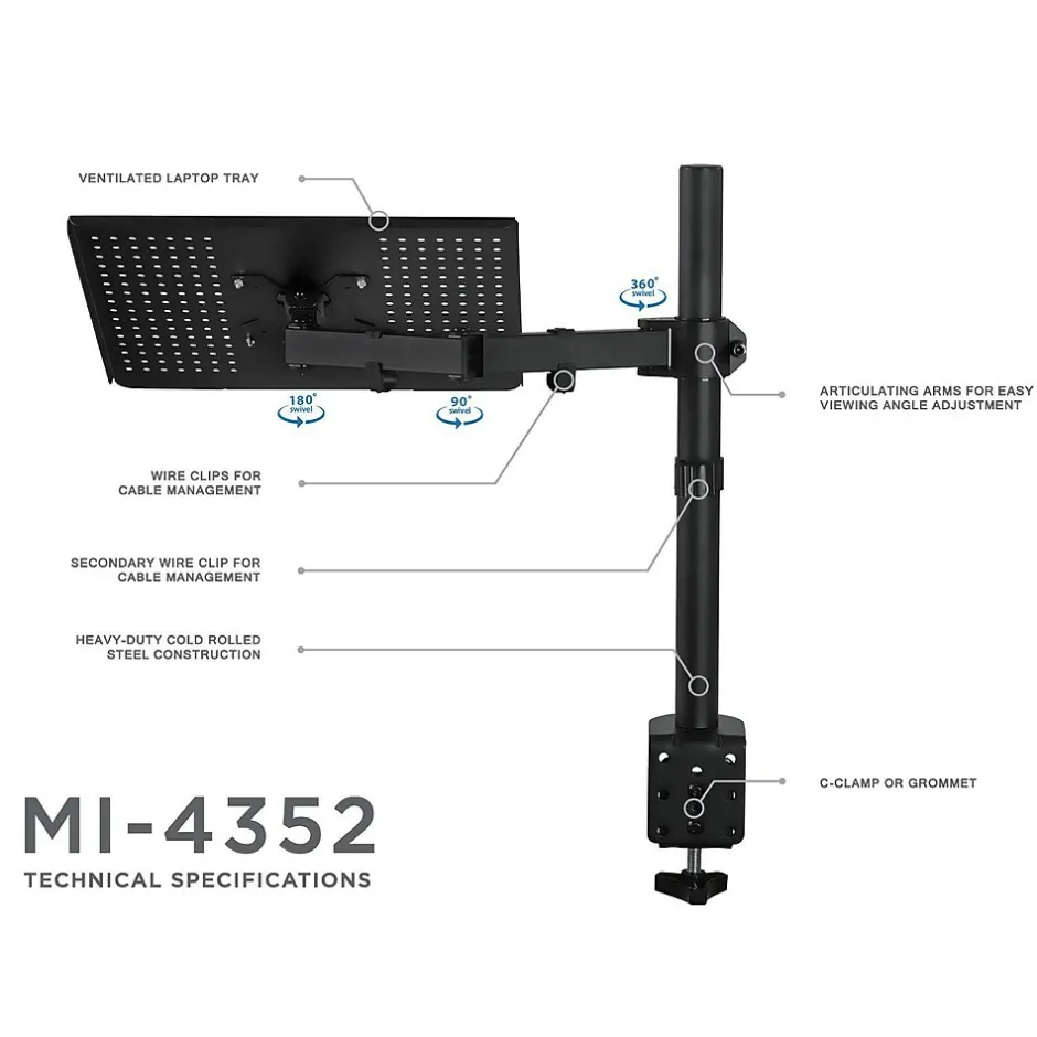 Full motion capability allows the user to move the laptop closer or farther away, as well as turning it left and right. The arms holding the tray can be lifted or lowered on the 17.7″ high pole. Cable management clips helps organize cables running to the computer.
