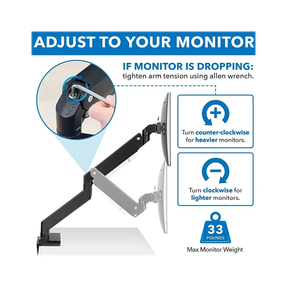Raise your monitor to an ergonomic position, and free up desk space with this dual-monitor mount. The heavy-duty gas spring arms hold up to 33 lbs. per arm and feature fluid full-motion movements to achieve the perfect monitor placement. The mount includes both clamp and grommet installation options to fit a variety of desks. Tilt and swivel functionality offers multiple monitor angles for comfortable reading, and integrated cable management keeps your cords off your desk.