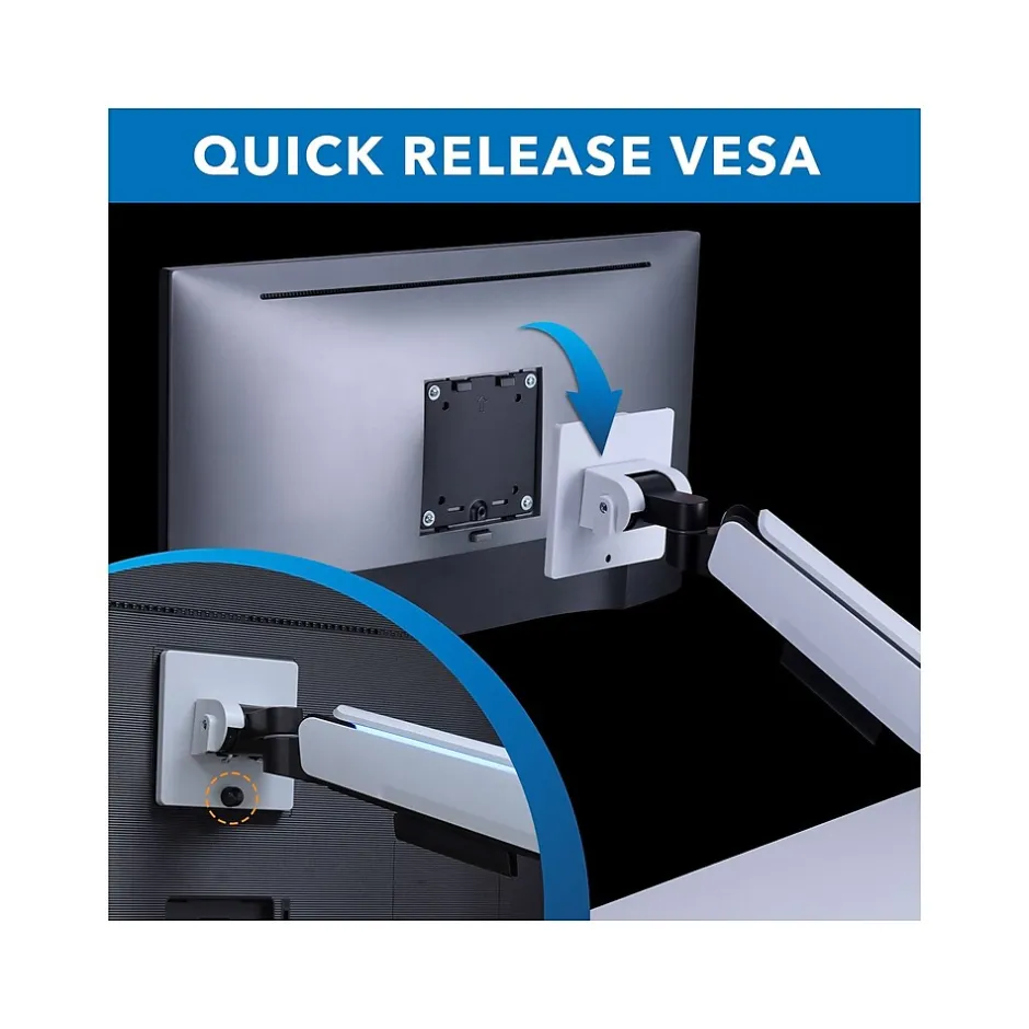 Create your perfect immersive gaming station or a professional multiscreen desk setup with this Mount-It! desk mount for monitors with screen size up to 49″ and weight up to 44 lbs., such as Samsung Odyssey G9 and LG 49″ UltraWide Dual QHD. The mount’s optimized heavy-duty tilting and gas spring mechanisms allow for smooth and stable adjustment of large screens. The full-motion design enables you to lower and raise, swivel, tilt, and rotate your screens to achieve the perfect viewing height and angle. To fully immerse in your game, this mount features RGB lighting along the arms and on the base: simply switch between 20 different modes by pressing the easily accessible RGB mode button on the base. Both, a clamp and grommet mount are included for easy installation on your desk. The detachable VESA plate with 75 x 75 and 100 x 100 hole patterns allows for quick installation of your monitors, and the integrated cable management ensures neat and organized cable routing along the arms.