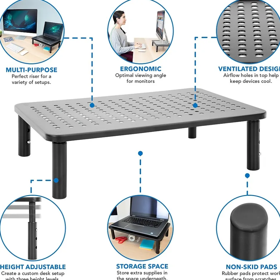 This 2-pack of Mount-It! metal risers is height-adjustable with three settings. Create more desk space by storing the keyboard and mouse under the riser. The legs feature nonskid rubber pads that will prevent your work surface from scratches. The sturdy stand can hold up to 44 lbs. Comes in gray.
