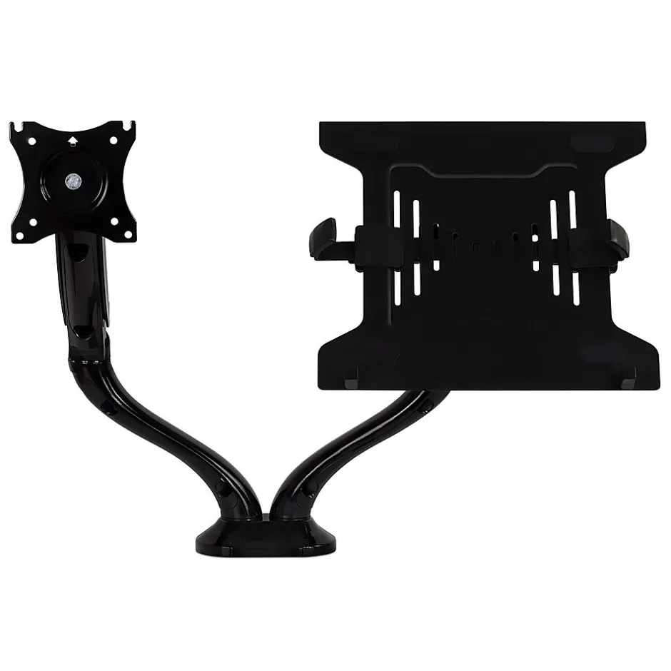 MI-6352LTMN laptop and monitor desk mount combo helps reduce the risk of back and neck injury that is common with hours of sitting in an incorrect body posture.