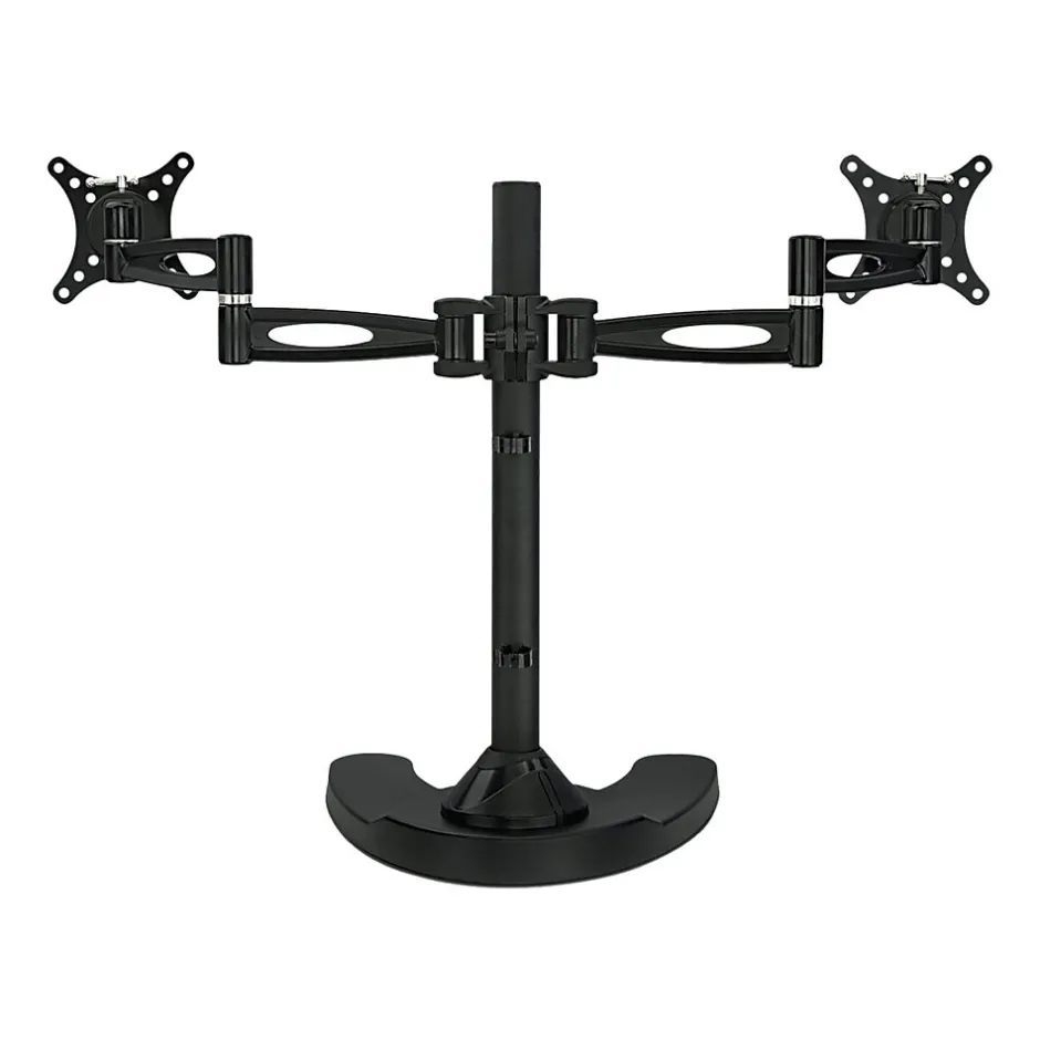 - FULLY ADJUSTABLE: Two monitor mount arms can tilt up and down 15 degrees, swivel left-right 360 degrees, raise and lower 17″ inches on the pole, and each screen can be rotated and placed in portrait or landscape orientation independent of one another.
