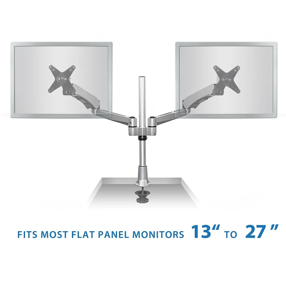 MI-45111 dual monitor mount features two gas spring arms for smooth full motion monitor adjustments. The extra long mounting pole measures 20.5”, allowing for a large height adjustment range. From height adjustment, to monitor tilt, swivel and rotation, this monitor desk mount is designed to maximize the user’s efficiency and comfort. Boost productivity and enhance workflow with double the screen space, while improving posture and clearing up more desk space by elevating the monitors. This premium dual monitor mount is fully TAA (Trade Agreements Act) compliant and is suited for purchase by the U.S. government. It is a modular monitor mount, meaning it is fully customizable with the ability to add or remove monitor-mounting arms, which allows an organization to develop cost-effective, tailored solutions for their employees’ needs. The c-clamp base easily attaches to any desk measuring.79” to 2.36” thick, making it an easy addition to any workspace. It also includes a grommet base that securely attaches to a desktop hole opening. Each arm can carry monitors measuring in size up to 32” and up to 19.8lbs per mounting arm.