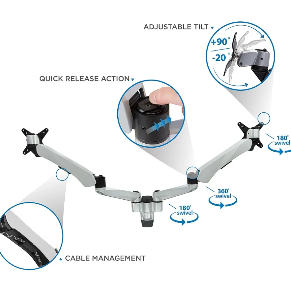 - Gas Spring Arms have Tilt, Swivel, Height Adjustable and Rotating Features