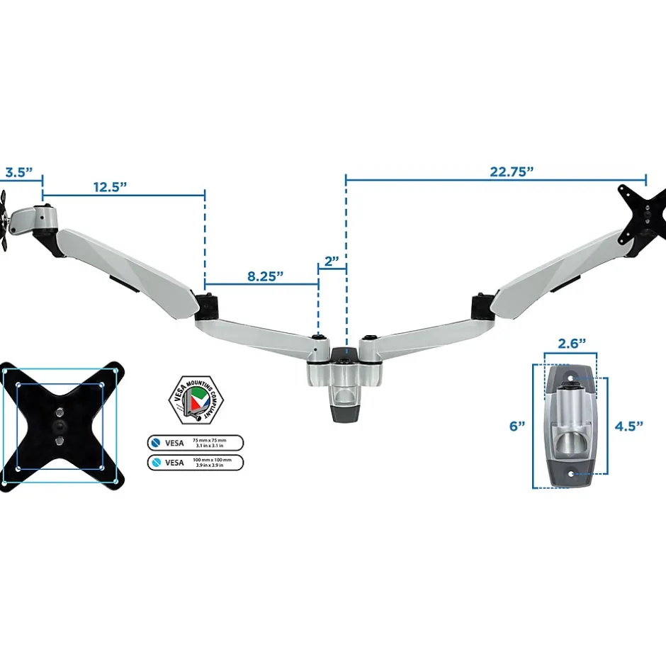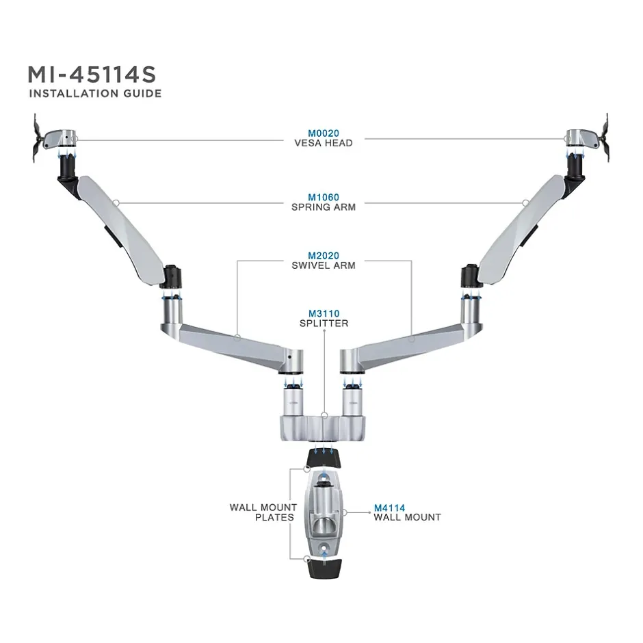 MI-45114 dual monitor wall mount features two gas spring arms for smooth full motion monitor adjustments. From height adjustment, to monitor tilt, swivel and rotation, this monitor wall mount is designed to maximize the user’s efficiency and comfort. Boost productivity and enhance workflow with double the screen space, while improving posture and maximizing space in the office or at home. This premium dual monitor wall mount is fully TAA (Trade Agreements Act) compliant and is suited for purchase by the U.S. government. It is a modular monitor mount, meaning it is fully customizable with the ability to add, remove, shorten or lengthen each of the monitor-mounting arms, which allows an organization to develop cost-effective, tailored solutions for their employees’ needs. The easy to install wall mount requires only a single stud for installation making it a quick addition to any workspace. Each arm features a cable management port to hide and organize cables for a clean look. Each arm can carry monitors measuring in size up to 32” and up to 19.8lbs per mounting arm.