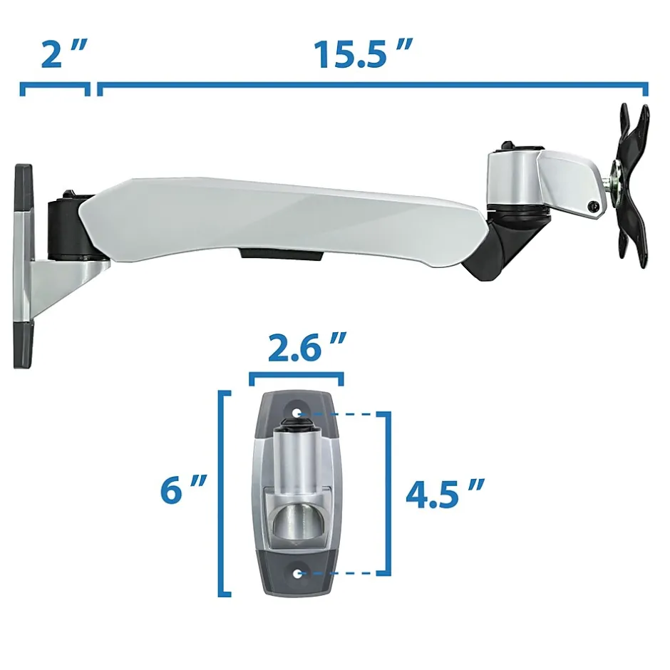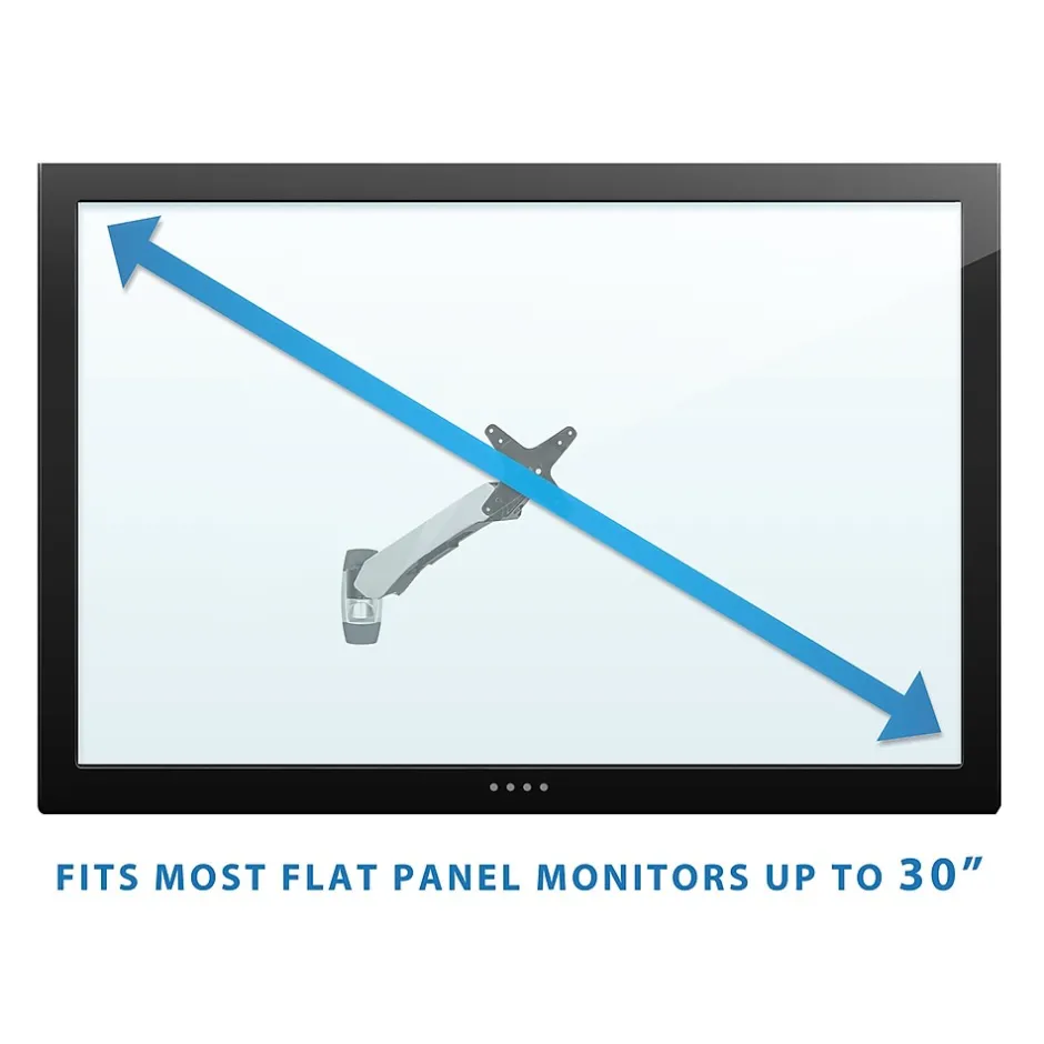 MI-34114 Single monitor wall mount features an articulating gas spring arm capable of smooth full motion movements, including height adjustment, tilt, swivel and rotation to fully adapt to your working preferences. This wall mount is designed to desk and office save space while improving posture by raising the monitor to eye level in any type of environment. This premium monitor wall mount is fully TAA (Trade Agreements Act) compliant and is suited for purchase by the U.S. government. It is a modular monitor mount, meaning it is fully customizable with the ability to add, remove, shorten or lengthen the monitor-mounting arm, which allows an organization to develop cost-effective, tailored solutions for their employees’ needs. The easy to install wall mount requires only a single stud for installation making it a quick addition to any workspace. The arm features a cable management port to hide and organize cables for a clean look. It can carry monitors measuring in size up to 32” and boasts a 20lb load capacity.