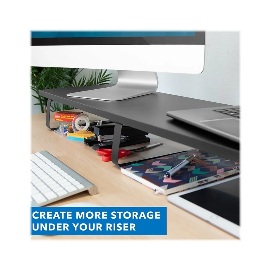 This monitor riser is your work solution for organizing your dual monitor setup while providing space-saving, ergonomic design with a stylish black wooden surface and heavy duty solid steel frame. Enjoy optimal viewing angles by raising both of your monitors to the correct height with this extra-long monitor riser. Reduce hours of strain on your neck, back, and shoulders while increasing your overall health, too!