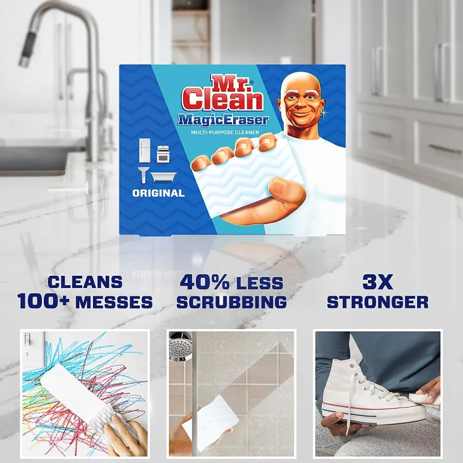 - Mr. Clean Magic Eraser Original scrubber requires 40% less scrubbing* *Cleaning performance vs. the leading all-purpose bleach spray