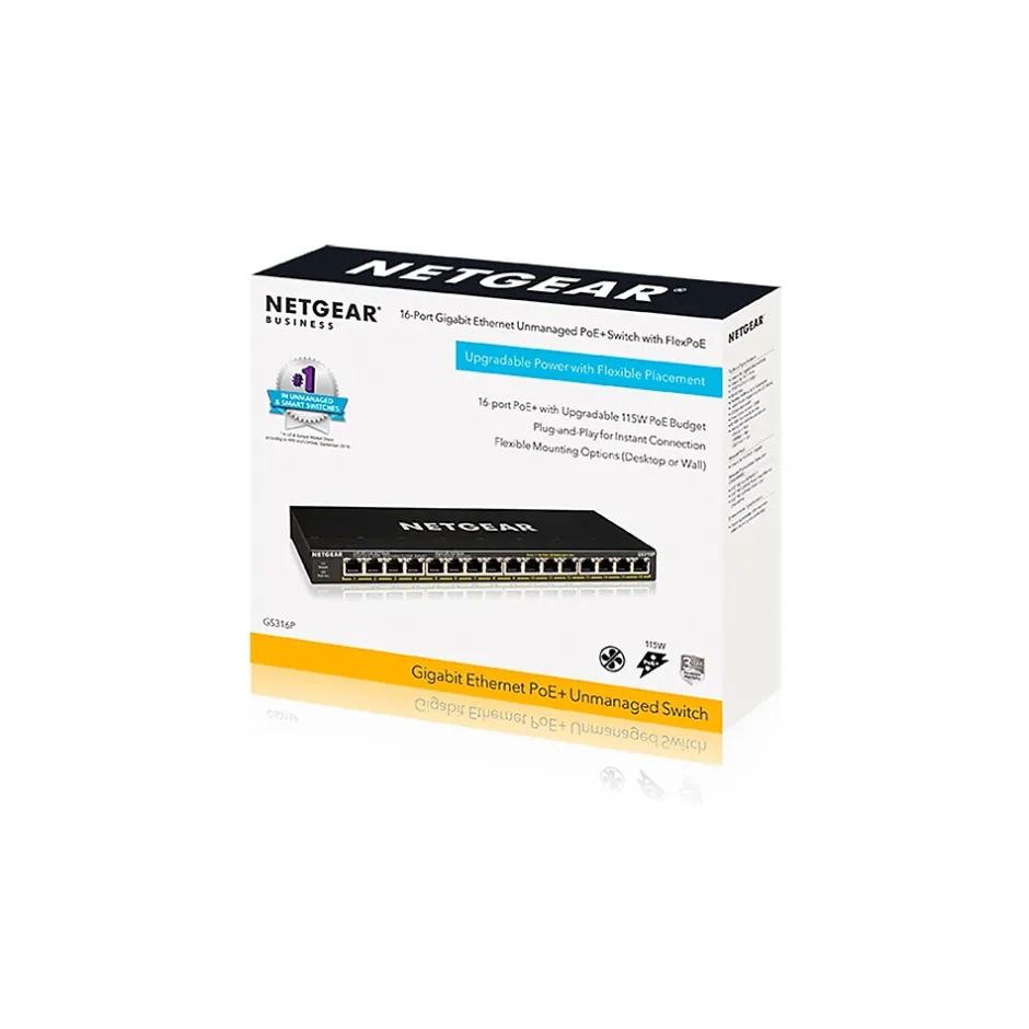 Netgear 16 PoE+ ports with 115W power budget. Unmanaged 300-Series PoE Switches are easy, reliable, and affordable network connectivity for home and small offices. Providing power and data from a single Ethernet cable.