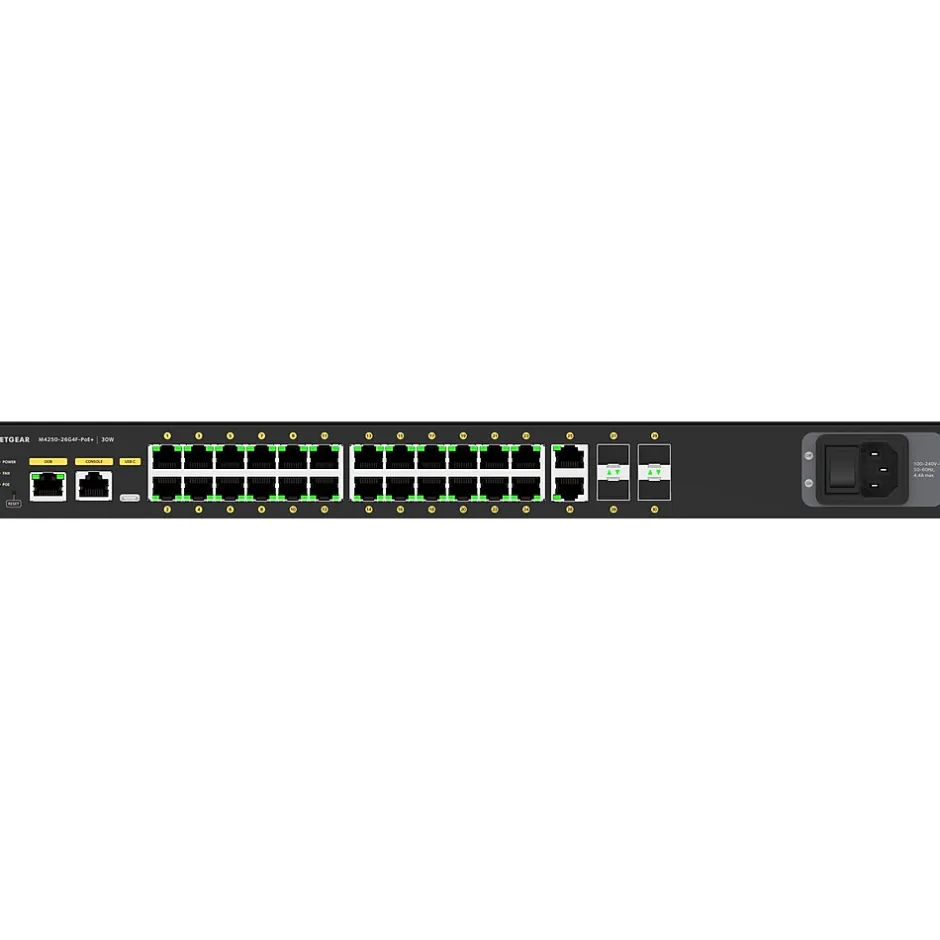 - Layer 3 managed switch with 26x gigabit Ethernet and 4x SFP ports engineered for 1Gb AV over IP