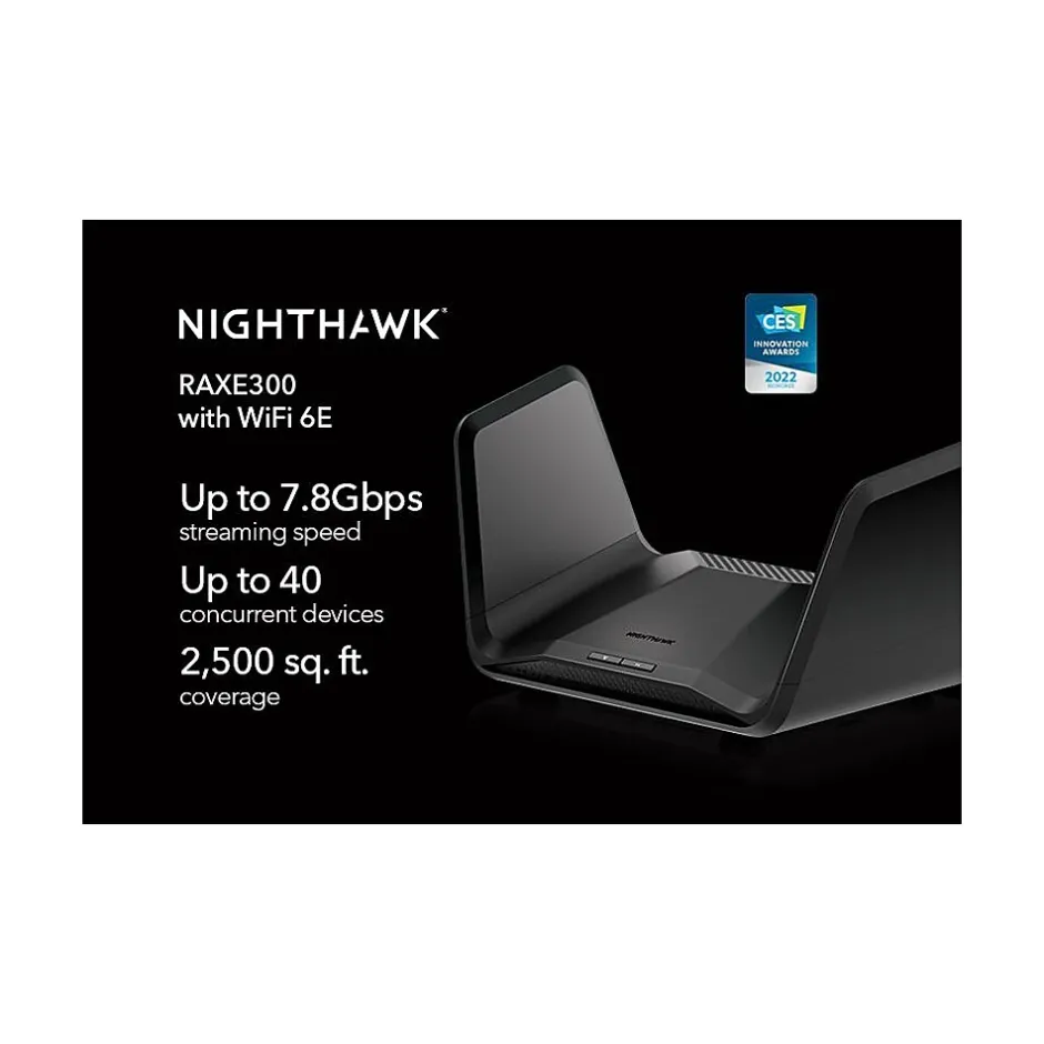 The NETGEAR Nighthawk RAXE300 Tri-Band WiFi 6E Router uses future-proof WiFi 6E and advanced NETGEAR technology to provide ultra-fast 7.8Gbps speeds and best-in-class performance, with up to 200% or more of the spectrum of WiFi 5 and WiFi 6. Enjoy smoother streaming, ultralow latency, and strong, reliable connections, especially when using high-bandwidth applications like 8K video streaming and AR/VR gaming. It’s brilliant Nighthawk engineering at an exceptional value – keeping up with everything you do in your hyper-connected home. With NETGEAR Armor, you get a one-stop Internet security solution that protects your connected devices, guards your sensitive information, and helps ensure your Internet activity remains private. One-year subscription included. Experience the ease of managing your kids’ time online across their connected devices and promote healthy habits anywhere they go with NETGEAR Smart Parental Controls.