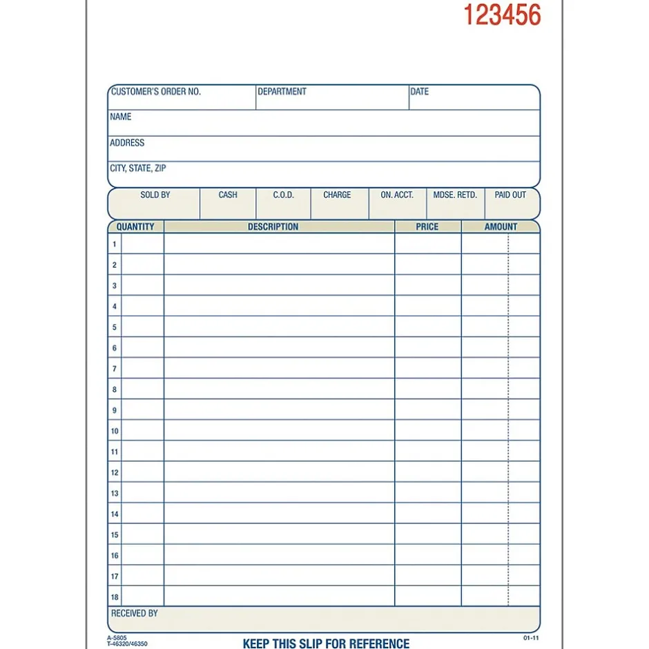 AdamsĀ® 2-Part sales order form book is numbered consecutively. Sales order form book is carbonless and has space at top for company stamp.