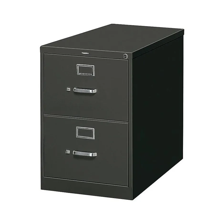 - Two-drawer vertical filing cabinet holds legal-size documents
