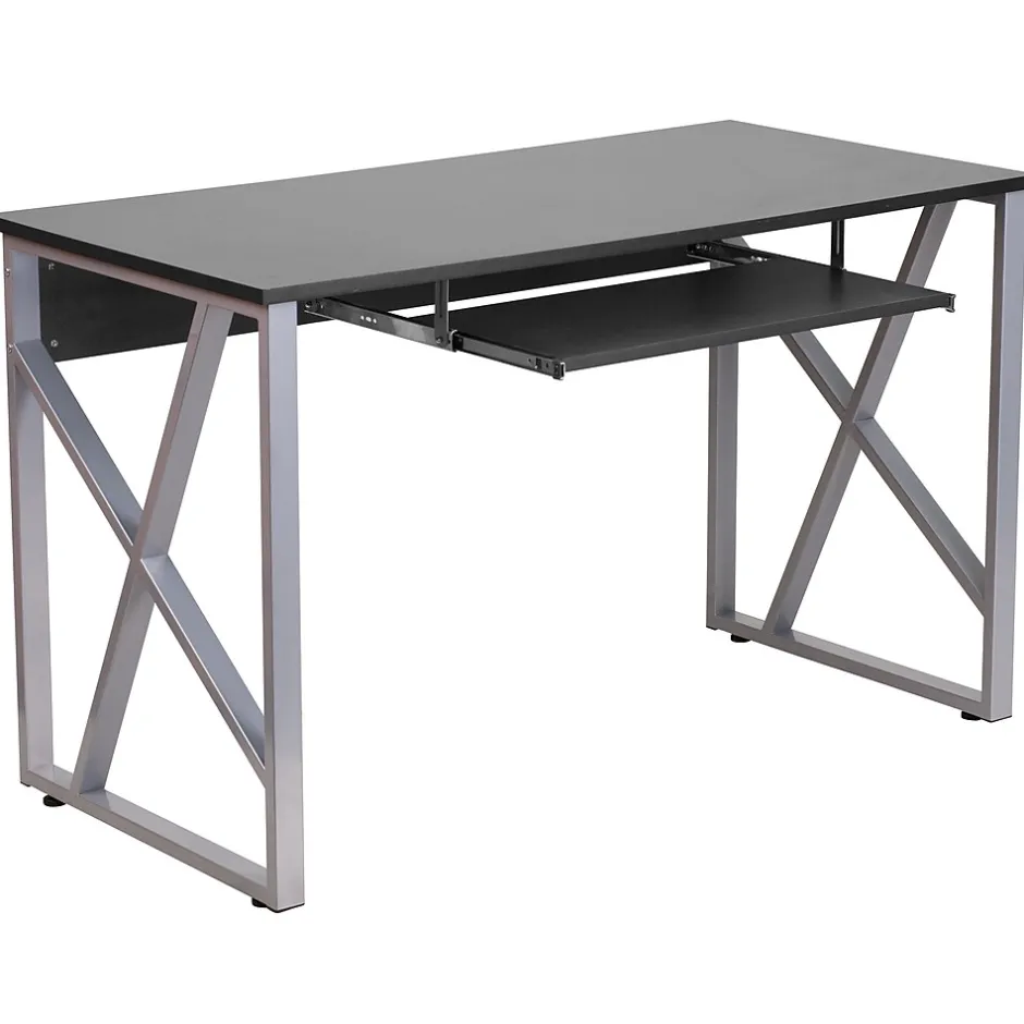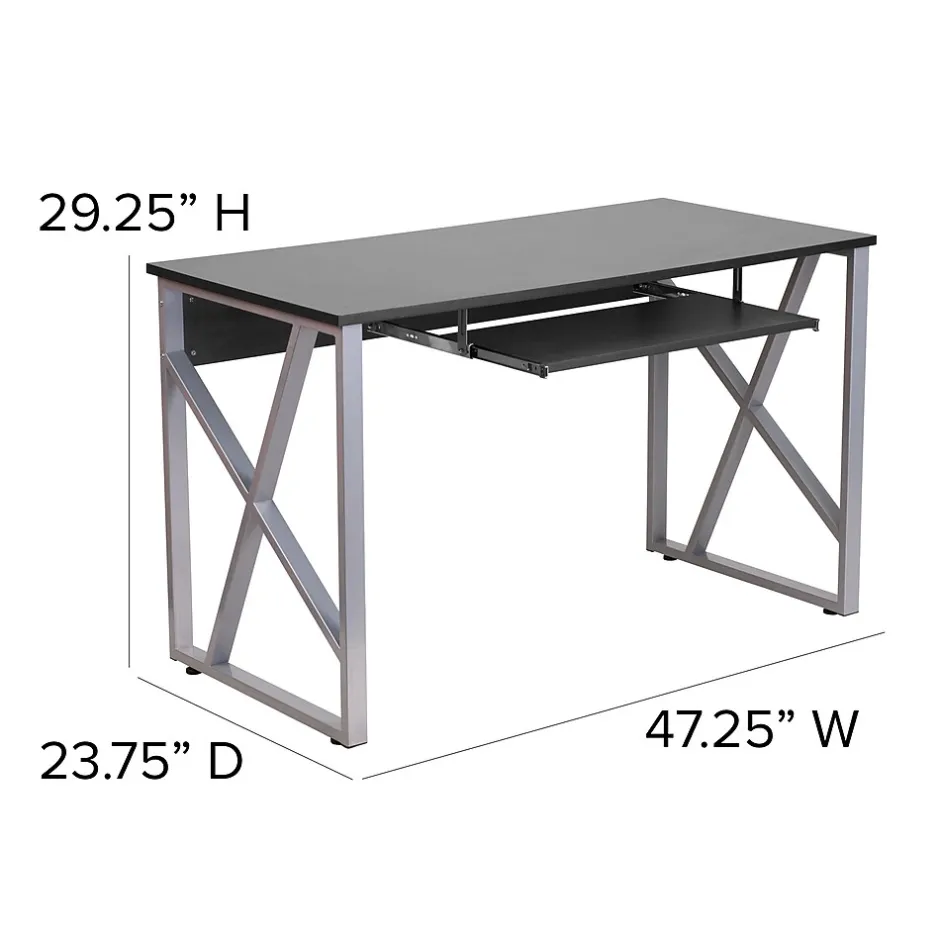The contemporary design features a rectangular black laminate top, a space-saving, sliding keyboard tray and attractive, silver powder coated, designer cross braces on both sides. Self-leveling floor glides keep your desk from wobbling on uneven floor surfaces and protect your floors by sliding smoothly when you need to move the desk. A panel, across the front, reinforces the frame as well as offering some privacy to the desk’s occupant.