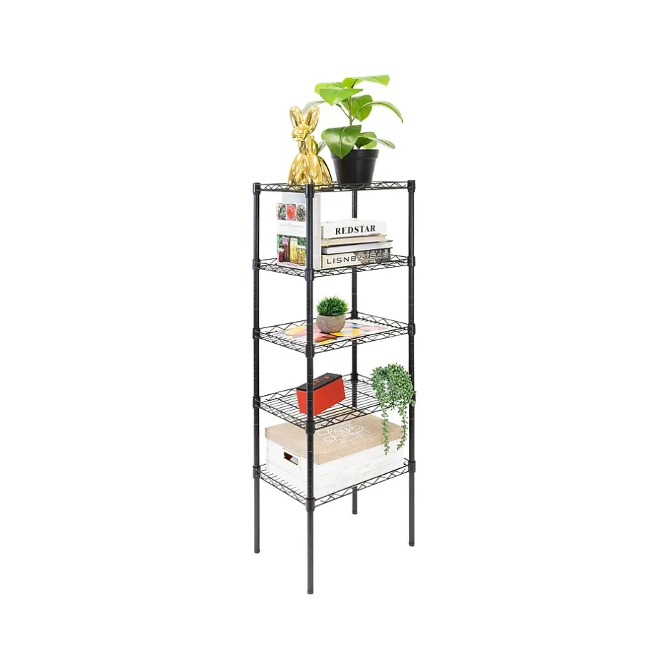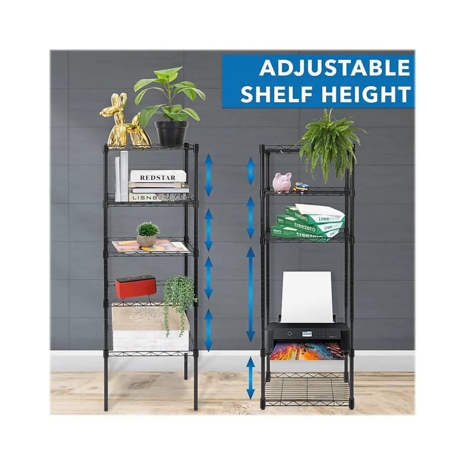 The Mount-It! five-tier metal shelving unit is the perfect metal storage rack for offices, kitchens, garages, laundry rooms, bathrooms, and bedrooms. With spacious shelves and a carrying capacity of 88 lbs. per shelf, this five-tier metal shelving unit can hold a plethora of items like office supplies, food, toiletries, and boxes. If you have larger items that are tall you can easily rearrange and adjust the shelf height in order to fit your larger items. There is no better solution to simple storage than Mount-It! storage shelves with adjustable feet.