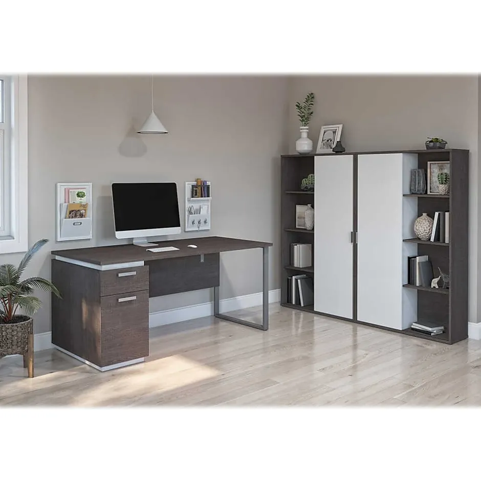 Thanks to this stylish desk set, you can furnish your office space in one shot. The desk’s work surface provides sturdiness and durability, while the U-shaped steel leg, aluminum handles, and layered desktop contribute to a modern look. The pedestal offers drawers to organize your documents and keep your office supplies close at hand. You can display books and decorative items on the storage cabinets’ shelves and conceal clutter behind the sliding doors. The storage cabinets can be paired side by side or placed separately in the room. Combine style and functionality thanks to this stylish bundle. This desk set is backed by the bestar 5-year manufacturer warranty.