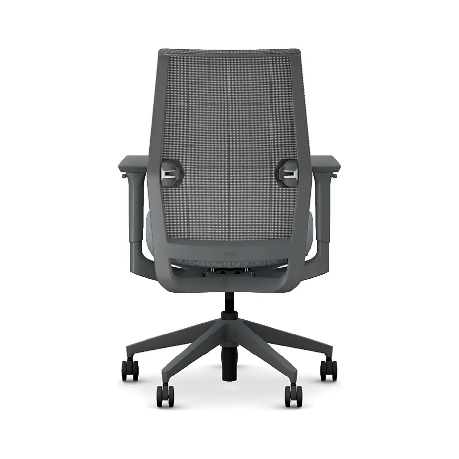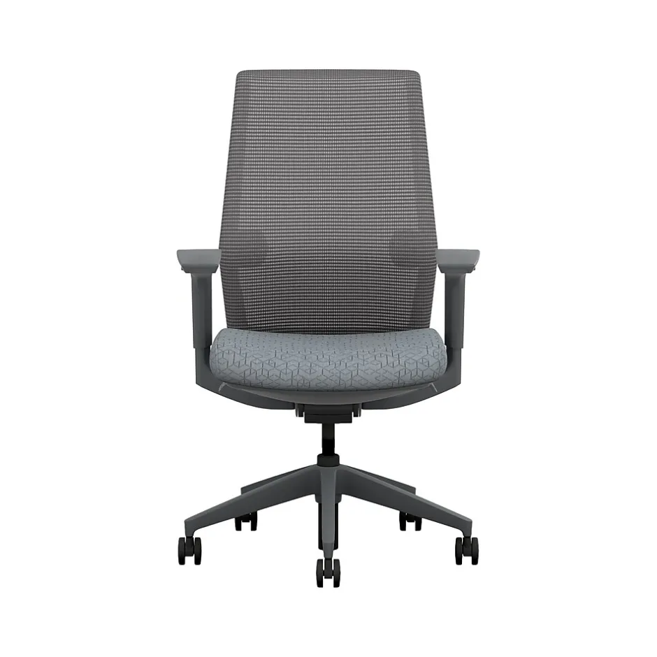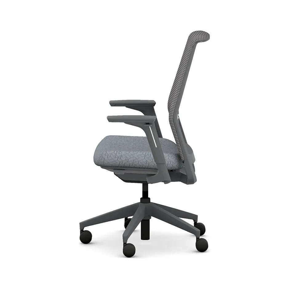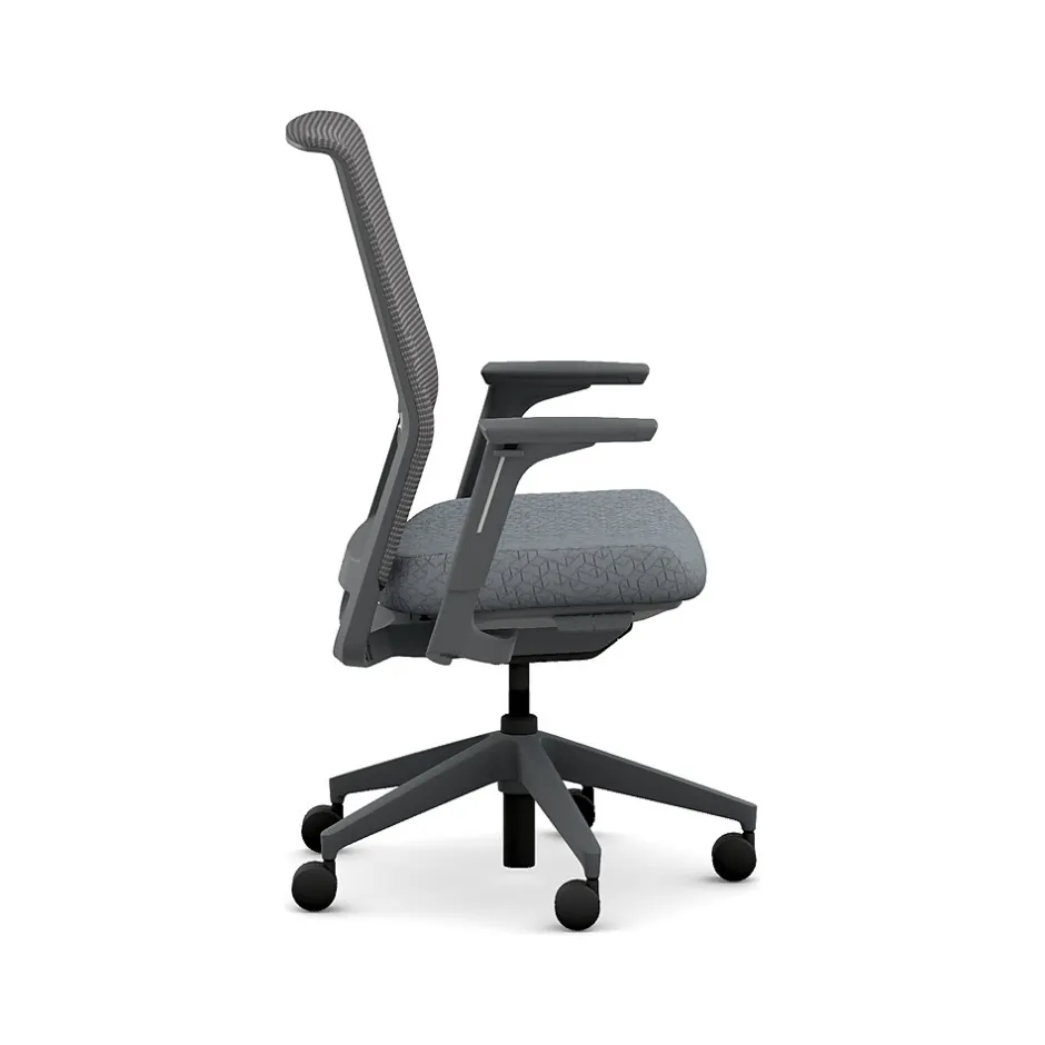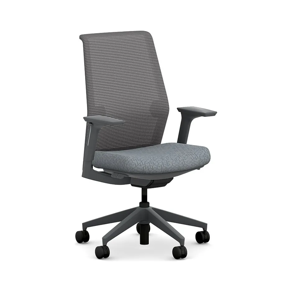 - Four-way stretch mesh back in charcoal gray, Apex basalt gray fabric seat, and charcoal gray frame