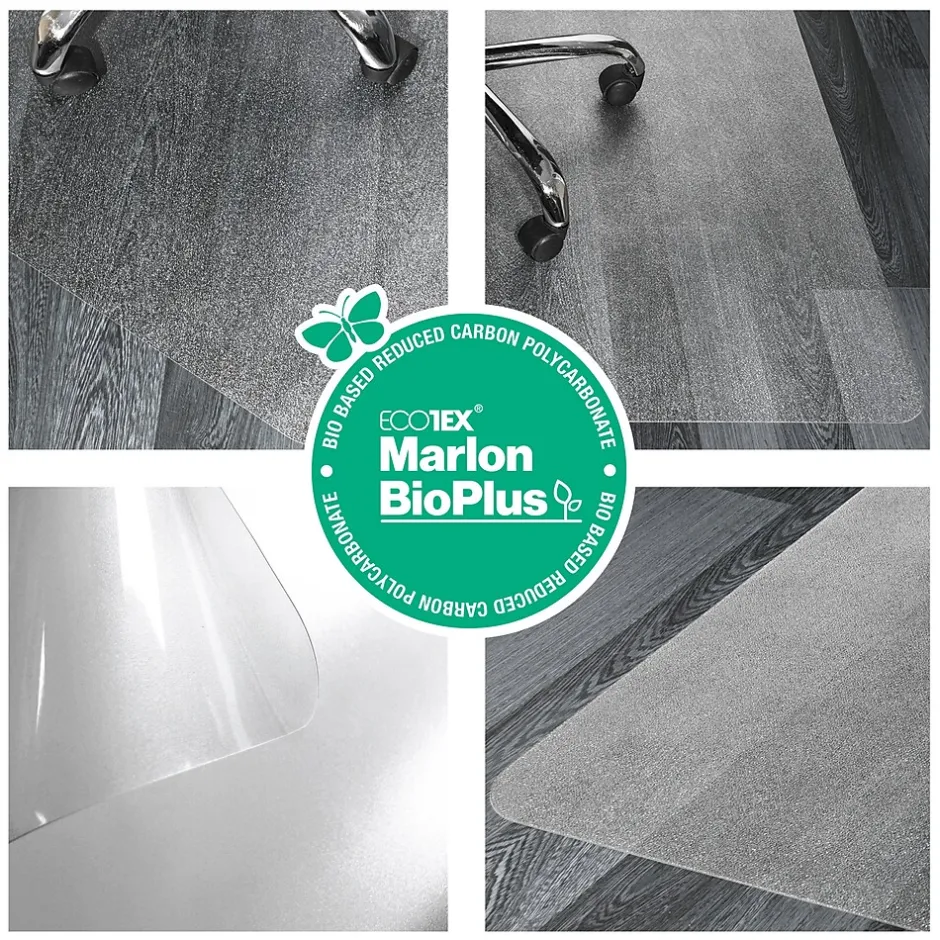Produced using a “Mass Balancing bio-circular” process with both the resin and chair mat manufacture ISCC certified. (International Sustainability & Carbon Certification). With twice the impact strength of PVC, the perfectly flat and rigid material provides an ergonomic easy glide surface for caster based chairs, which can reduce leg fatigue and lower back strain. Guaranteed not to crack, curl, discolor or smell. Free from Phthalates, PVC and toxic chemicals. An ideal choice for people with allergies. Manufactured in the UK using 100% Renewable Energy, including solar and wind power. The resin manufacture is climate neutral with a 100% reduction in carbon emissions. Contains 89% non-fossil based bio-circular material, such as used cooking oil, for a dramatically reduced impact on the environment. 100% recyclable. Marlon BioPlus mats lie perfectly flat from delivery for immediate use. Limited Lifetime Warranty.