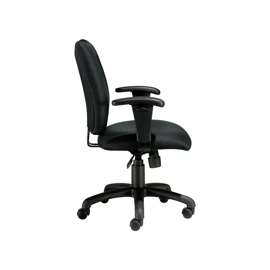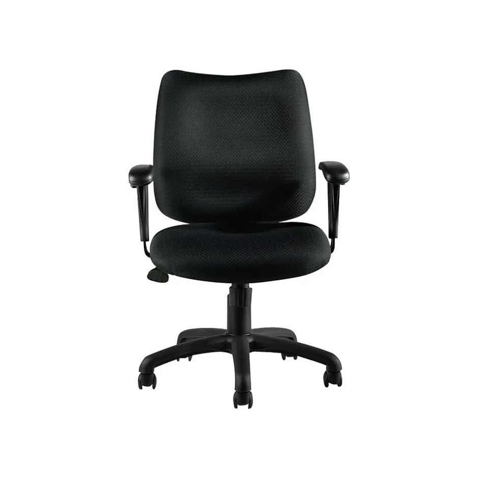 Bring a simple seating solution to your workspace with this Offices To Go tilter chair. The patterned black fabric upholstery stands up to heavy use, making this desk chair ideal for use in co-working spaces. A pneumatic seat height adjustment lever and height-adjustable arms offer personalized comfort, while the plush padding provides all-day support. Center tilt, tension adjustment and tilt lock work together to help you recline back in the seat whenever you need to relax. Featuring a uniquely contoured waterfall seat, this Offices To Go tilter chair promotes better circulation to keep you working the whole day through.