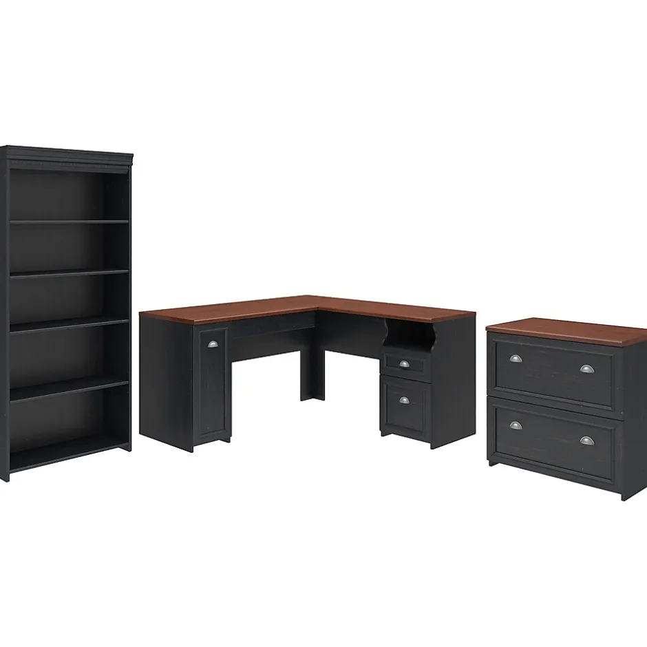- Bundle includes: 60″W L-shaped desk with storage, two-drawer lateral file cabinet, tall five-shelf bookcase