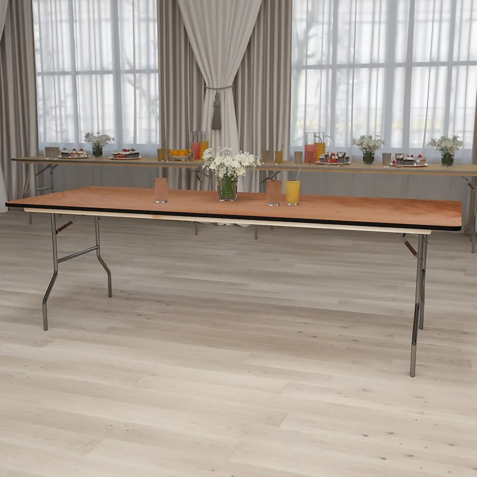 If you want a table that is sturdy, long-lasting and versatile enough to use anywhere this heavy duty folding table is as good as it gets! The Rectangular Wood Folding Banquet Table is a commercial grade table that can be used as a training table, trade show booth, or a banquet table. Featuring an Okoume hardwood surface, this table top is .75 inches thick, with a black T-mold edge band. Two heavy duty, wood runners, secured to the underside of the table, increase load capacity and allow for more secure stacking, transport and storage. The heavy duty wishbone legs lock securely in place when the table is in use. A black powder coating protects the legs from scratches, and non-marring floor caps protect your floor. This is a particularly good choice for party rental companies and other organizations that hold many events throughout the year.
