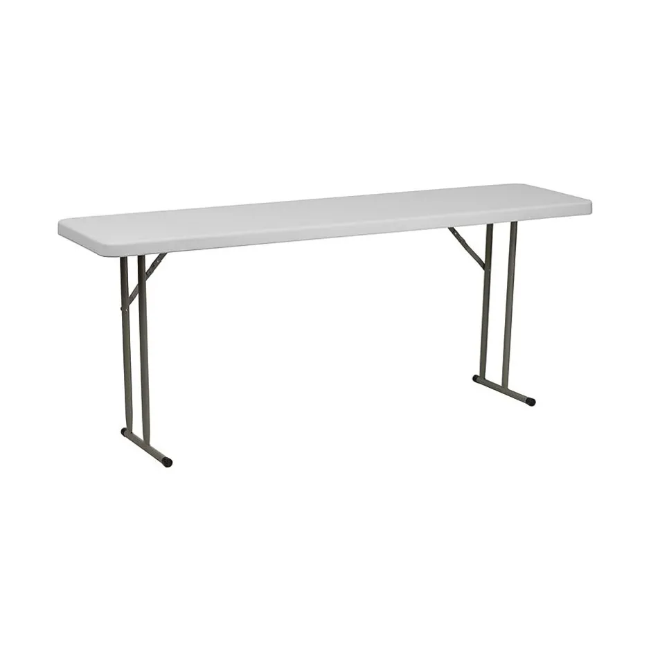 Fill that new designated training room with this narrow rectangular plastic folding table. The space saving design can fit multiple tables in small and large rooms making it the perfect training style table for any classroom or training facility. Have people pick up test packets and informational pamphlets on this perfectly sized folding table. Cleanup is simple on this durable, waterproof top to pick up spills quickly. This 6-Foot folding table seats 3 people on one side of the table allowing all at the table a clear view of the board and instructor. When you want to store or transport the legs lock underneath the top. Folding tables can be your go-to table to setup your products at convention centers.