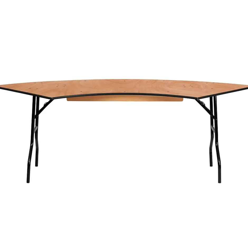 This semi-circular wood folding table allows you to create a serpentine, half circle or full circle table. The serpentine table allows you to create beautiful arrangements for weddings, banquets and other events. Create a serpentine table by placing two tables in alternate directions. Create a half circle or full circle by placing two or four tables together from end-to-end. The table legs fold under the table to make storage more convenient and for better portability. This table is commercial grade to withstand everyday use in the hospitality industry.