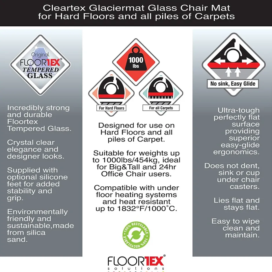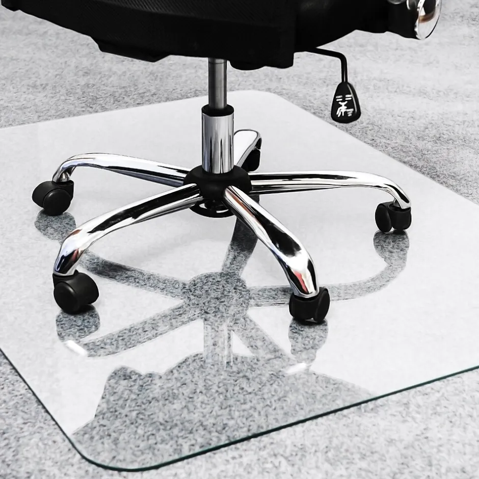 Ideal for executive or home office use. Our reinforced glass is tested up to 1000 lbs making it suitable for heavy office chairs or heavier users. Provides elegant, crystal clear floor protection from chair caster damage and general wear. The smooth and perfectly flat surface provides an excellent ergonomic easy glide surface for caster based chairs. Suitable for both hard floor and all pile carpet applications.