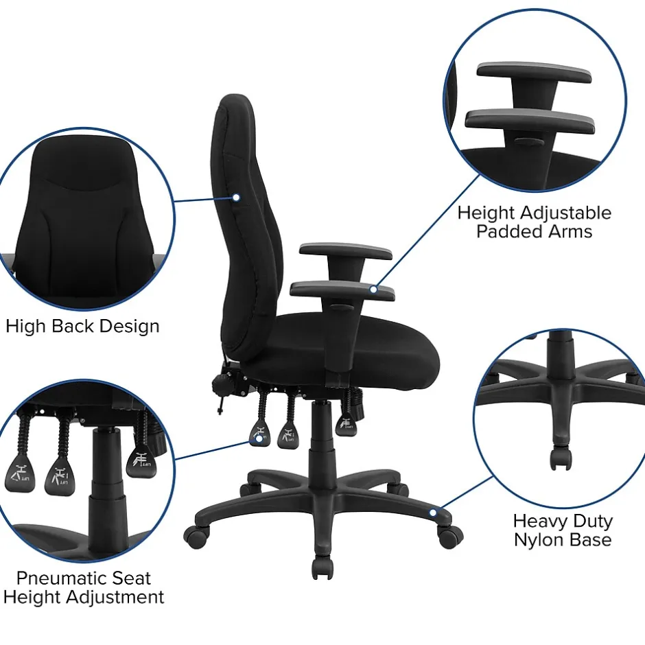 This black multifunctional office chair features a triple paddle control to adjust the seat height, back angle and tilt lock. Having the support of an ergonomic office chair may help promote good posture and reduce future back problems or pain. High back office chairs extend to the upper back for greater support and relieve tension in the lower back, preventing long term strain. The locking back angle adjustment lever changes the angle of your torso to reduce disc pressure while the back height adjustment knob positions the lumbar support to reduce back pain. The multi-tilt lock mechanism rocks/tilts and locks the chair in infinite positions. Chair easily swivels 360 degrees to get the maximum use of your workspace without strain. Adjustable armrests take the pressure off the shoulders and neck for added support. The pneumatic adjustment lever will allow you to easily adjust the seat to your desired height.