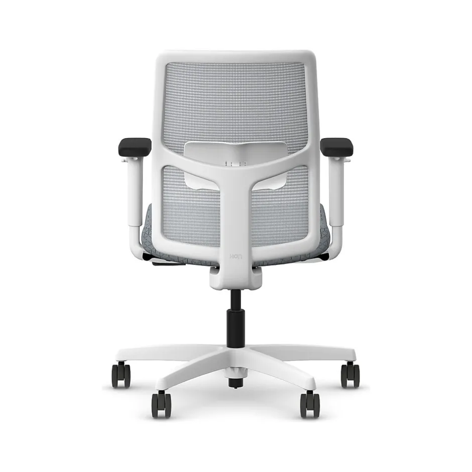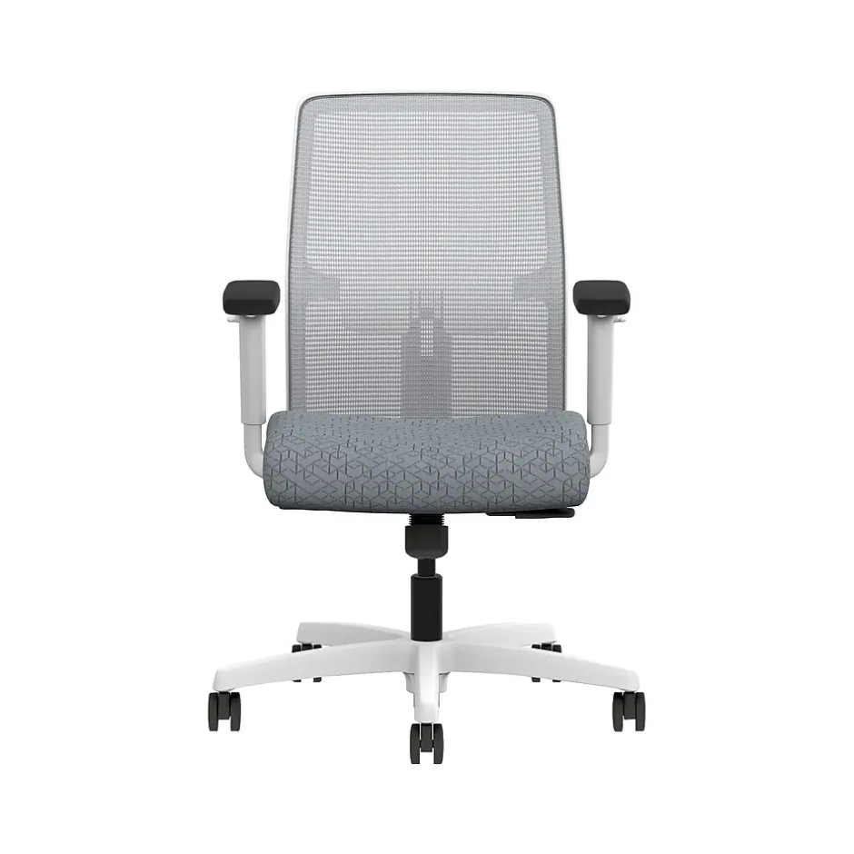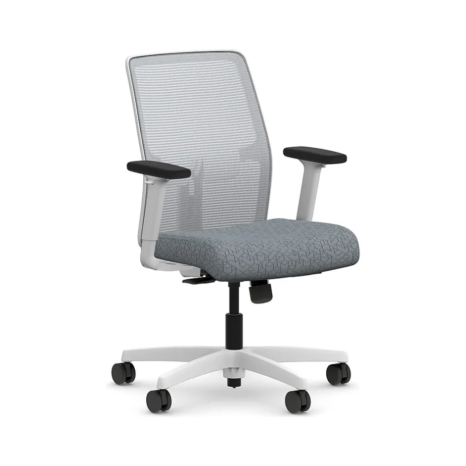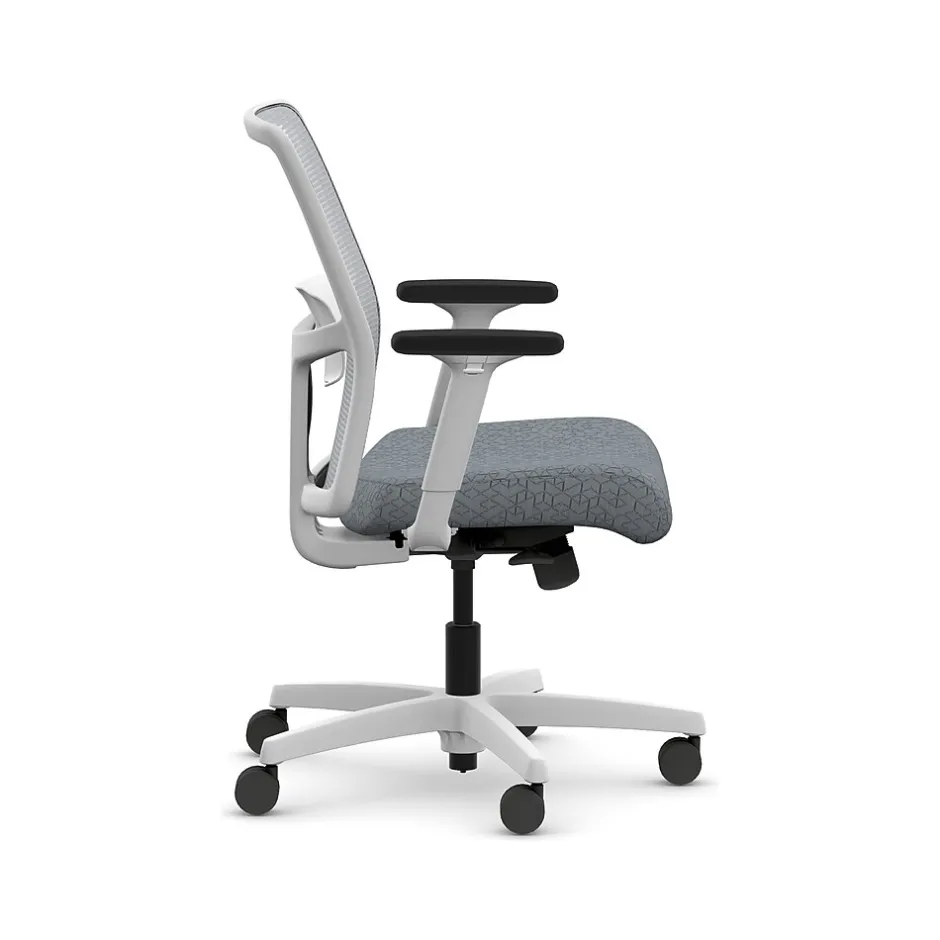 - Four-way stretch mesh back in fog gray, Apex basalt gray fabric seat, and designer white frame