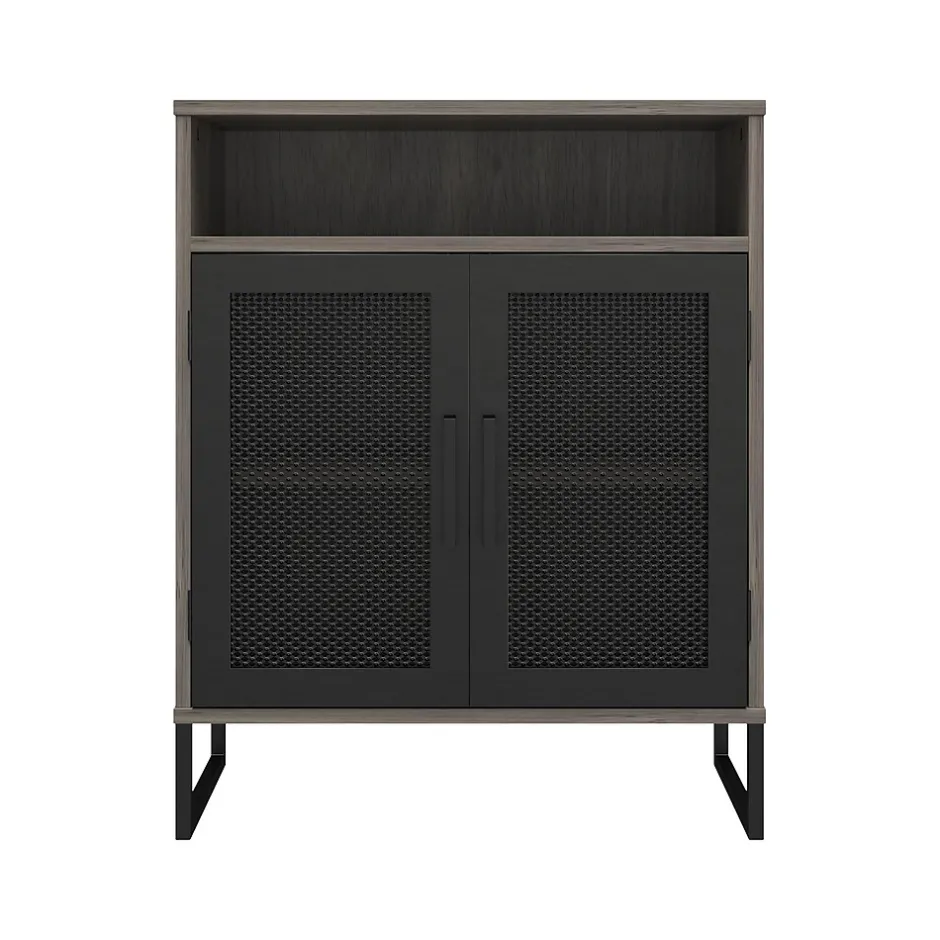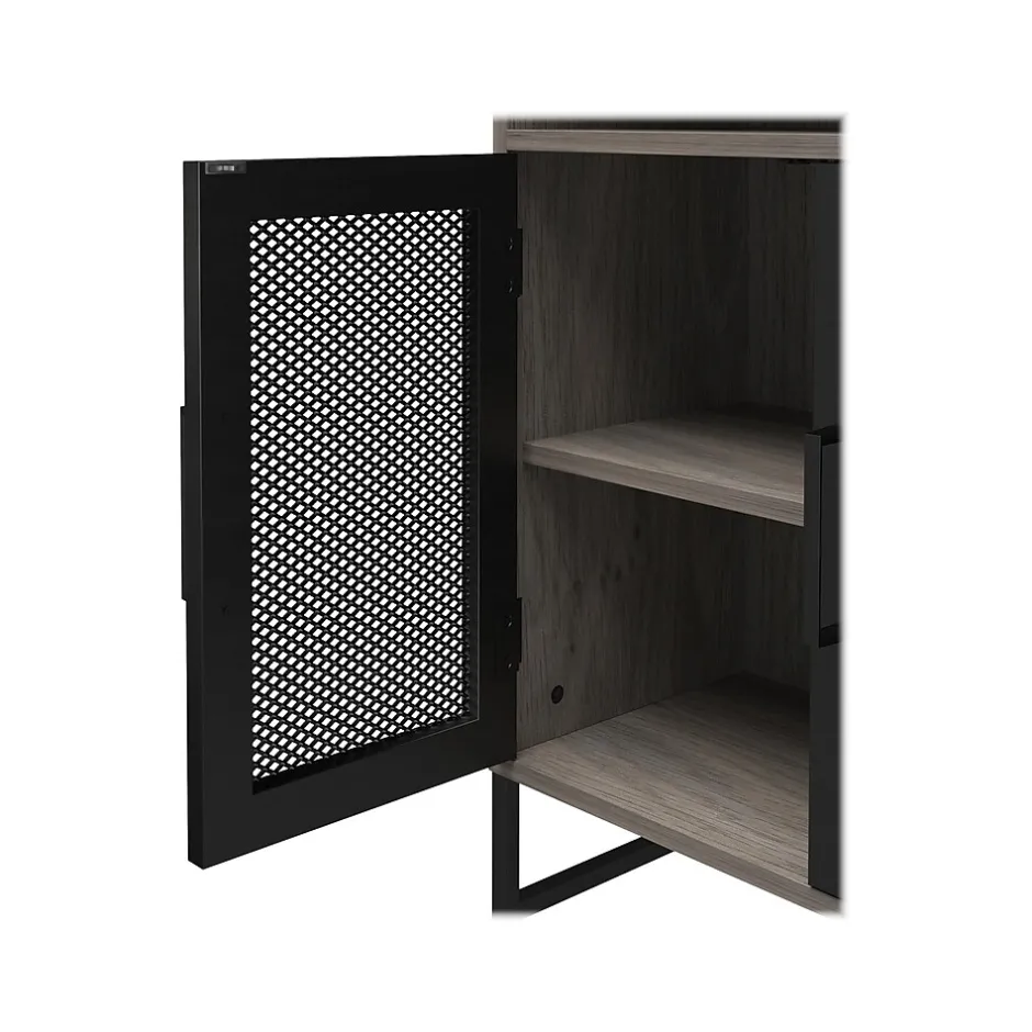 - Made of durable laminated MDF and particleboard in a gray oak finish with sturdy black powder-coated metal with stylish mesh front doors