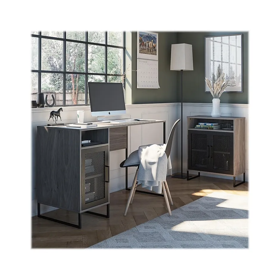 Streamline and organize your home office or dorm room with the Ameriwood Purdue storage cabinet. Made of durable laminated MDF, particleboard, and sturdy powder-coated metal, the gray oak finish and black metal legs give your space a modern upgrade you crave, at an affordable cost you can stomach. The Purdue storage cabinet, with its two doors and three shelves, makes a great addition to your work or study space, but its style and crisp design make for a perfect solution in any room where extra storage is desired. An open cubby just below the top is perfect for storing extra printer paper, pens or notepads, and the two spacious shelves below allow you to tuck away essentials out of sight to keep your home looking neat and clutter-free. The metal mesh cabinet doors are carefully crafted with a magnetic catch for a smooth and secure close every time. The top shelf behind the cabinet doors can be adjusted or removed for exceptionally tall to exceptionally small item storage.
