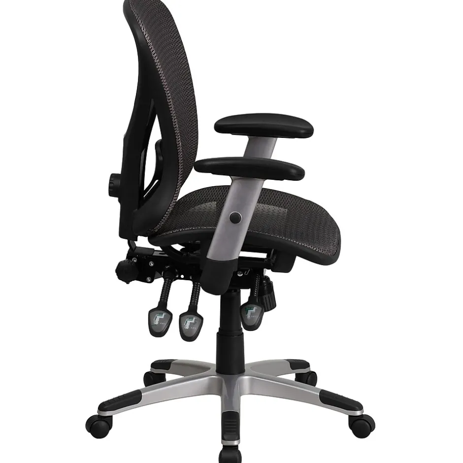 Mesh office chairs can keep you more productive throughout your work day with its comfort and ventilated design. This chair features transparent, breathable mesh material that allows air to circulate. The mid-back design offers support to the mid-to-upper back region. The tilt lock mechanism offers a comfortable rocking/reclining motion. The free rein motion is great for taking a quick break from typing to answer phone calls and relax. The waterfall front seat edge removes pressure from the lower legs and improves circulation. Chair easily swivels 360 degrees to get the maximum use of your workspace without strain. The pneumatic adjustment lever will allow you to easily adjust the seat to your desired height. The silver nylon base with black caps prevents feet from slipping when resting on chairs base.