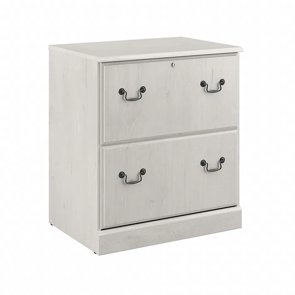 Enjoy the refined elegance of timeless traditional styling while keeping paperwork in order with the Bush Furniture Saratoga two-drawer lateral file cabinet. A perfect choice for virtually any office or private study, the file cabinet features two spacious file drawers that accept letter-, legal-, and A4-size documents. Drawers open on smooth, full-extension ball bearing slides for an effortless reach to contents and are designed to extend one at a time for maximum stability. Each drawer holds up to 60 lbs. of materials, and the upper drawer can be locked to protect your personal information and other sensitive paperwork. The two-drawer file cabinet’s classic appearance is enhanced by decorative edge details and old-fashioned drop handle drawer pulls. This locking file cabinet has been tested to meet ANSI/BIFMA quality standards for safety and performance and is backed by a 10 Year Manufacturer’s Warranty.