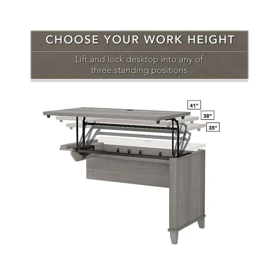 - Lift-and-lock desktop can be set at three standing height positions, 35″, 38″, or 41″, and easily returns to seated height