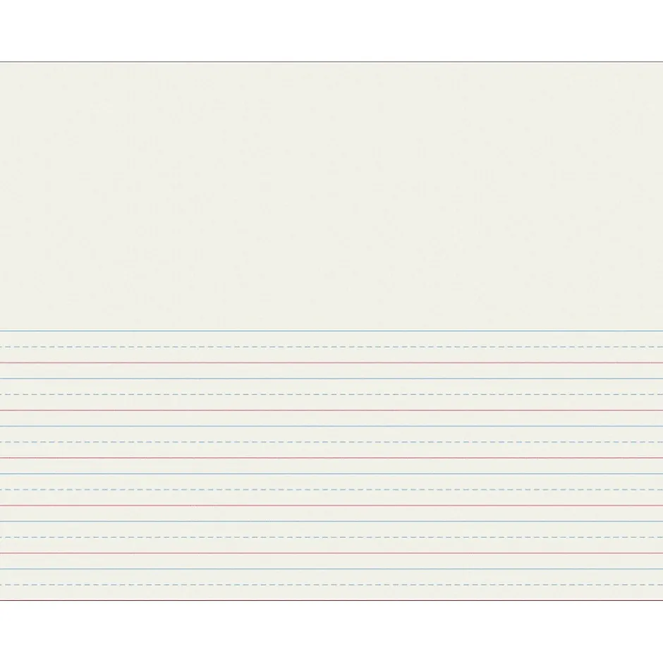 Clean white newsprint printed both sides with blue headline, broken blue midline, red baseline and skip-A-line format. Rulings conform to D’Nealian™ handwriting program.