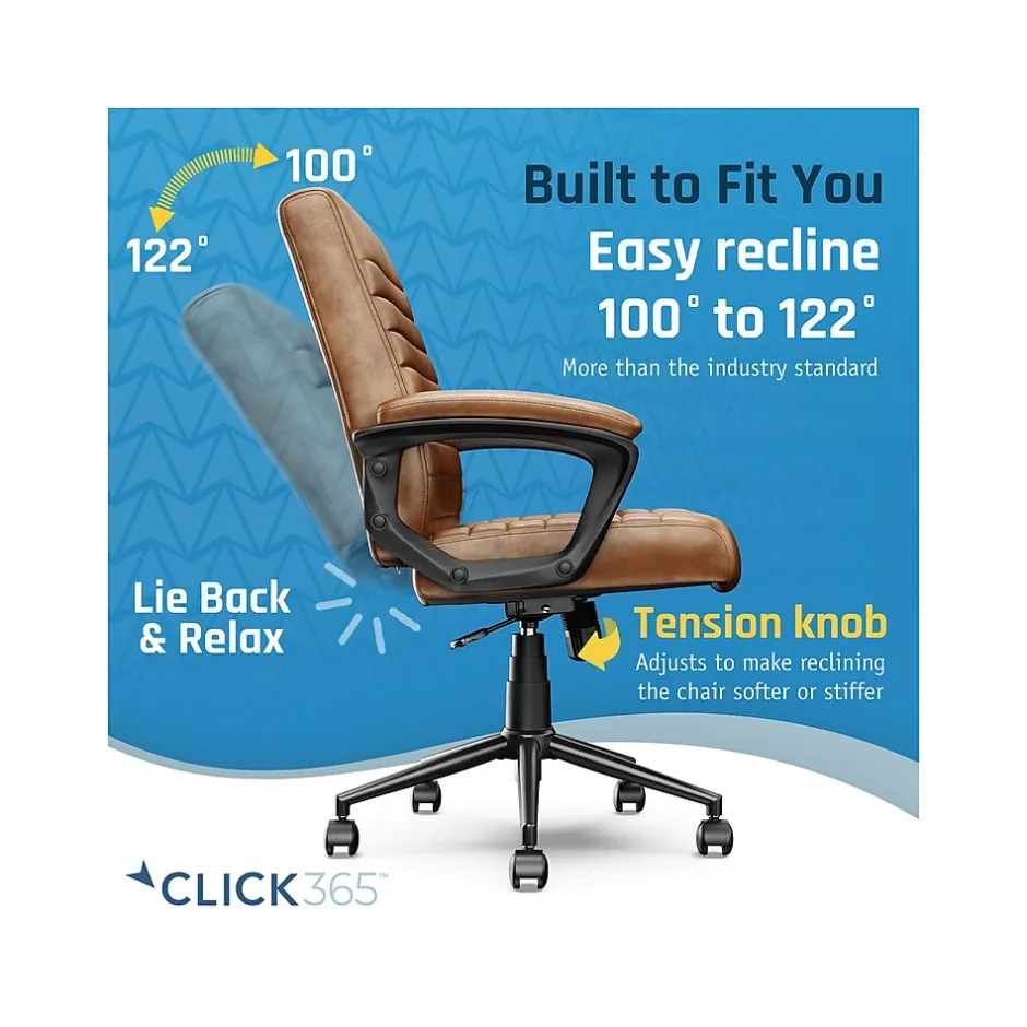 Bring relaxation to your busy workday with the Click365 Transform 3.0 ergonomic mid-back desk chair, which delivers American comfort with ultra plush padding in the headrest, back rest, and seat cushion. This chair has a 5″ thick contoured seat cushion and reliable ergonomic support, providing long-lasting comfort, and is perfect for everyday use at home and in the office. Pneumatic adjustable height, swivel base design, and quality smooth-rolling casters ensure this office chair is easy to move and position. The chair is upholstered in premium durable bonded leather over high-density foam and boasts a heavy-duty metal base and sophisticated stitching. You can purchase this chair with confidence.