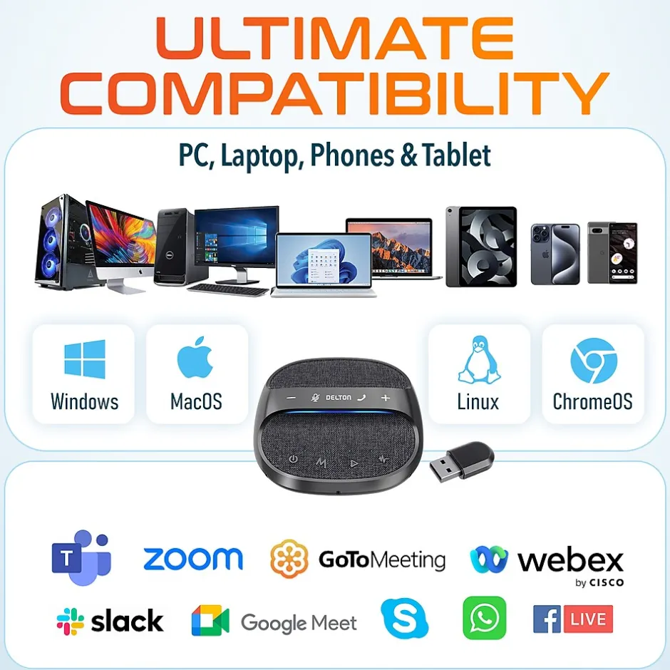 - Conference speakerphone works seamlessly with various devices and operating systems including Windows, MacOS, Linux, ChromeOS, and mobile platforms