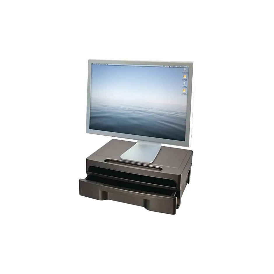 Raise your computer screen for a more comfortable view as you work with this monitor stand. The heavyweight plastic construction offers added strength and support, while the rounded corners add a sleek, professional look. A removable drawer keeps office supplies neatly organized and out of sight. With its convenient height, this Officemate monitor stand keeps your screen at eye level.