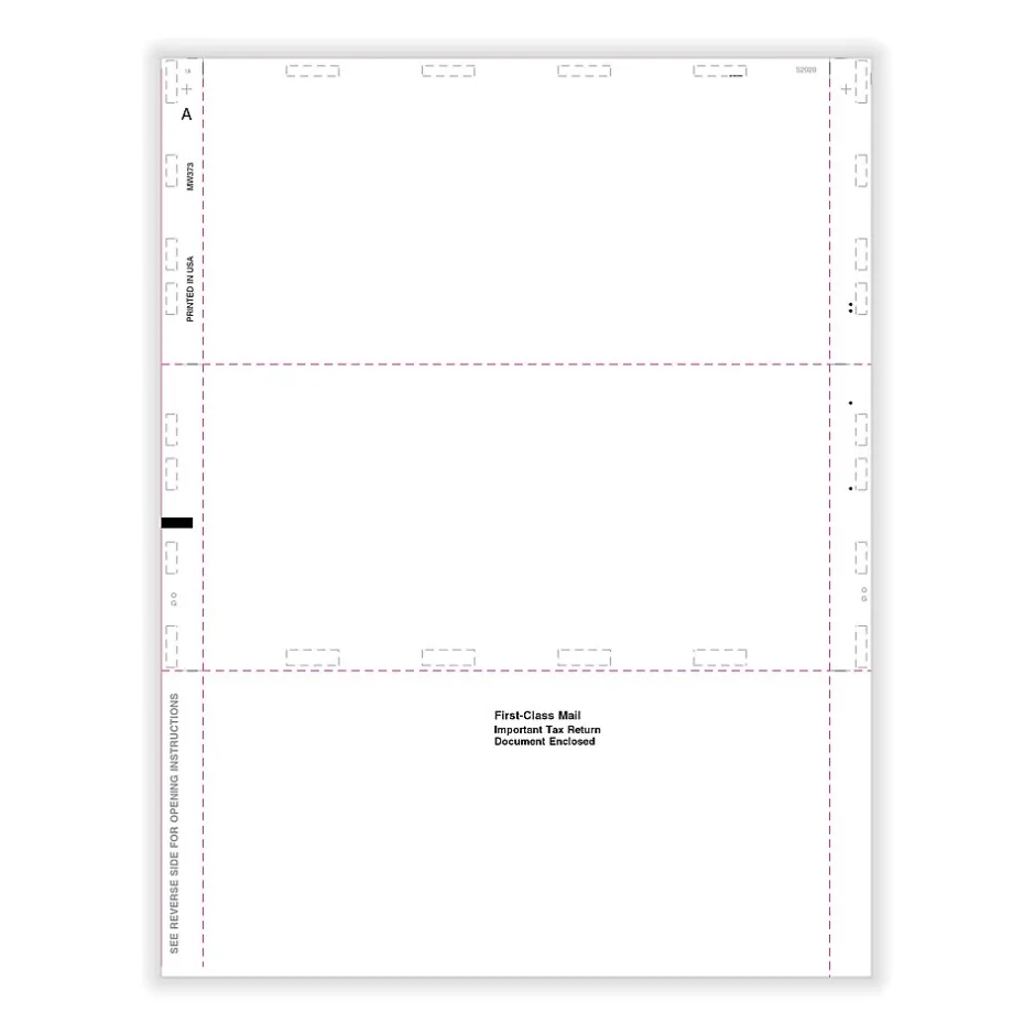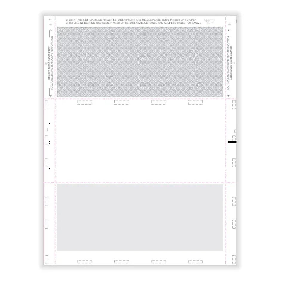 ComplyRight pressure-seal blank front and back form with self-mailer is perfect for printing 1099 tax forms. The form has security tint to protect information and can be used in folding and sealing equipment.