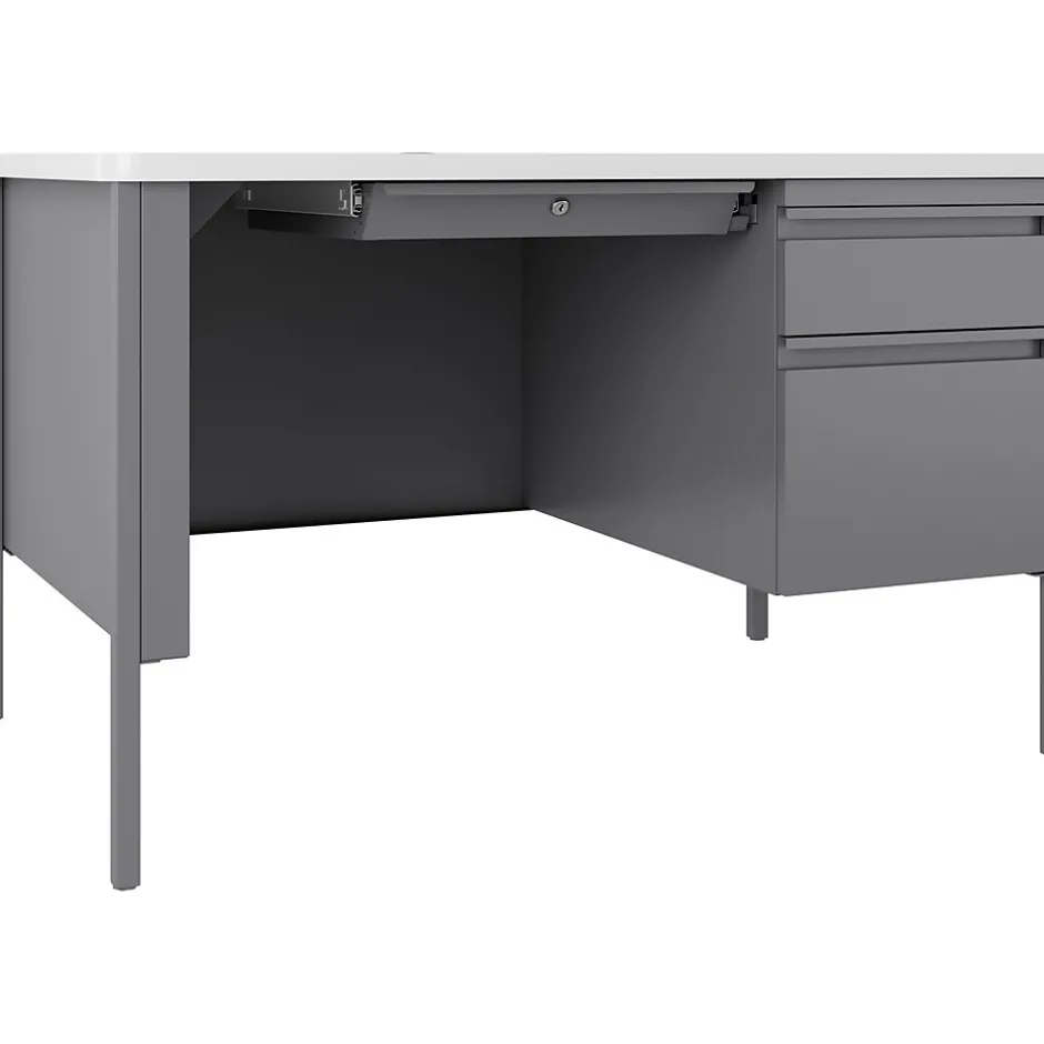 This teacher’s desk is constructed with high-quality steel and materials that are suitable for heavy use. Topped with a durable T-mold laminate designed for the classroom. Standard features include full extension ball-bearing slides for smooth drawer action and a locking center drawer.
