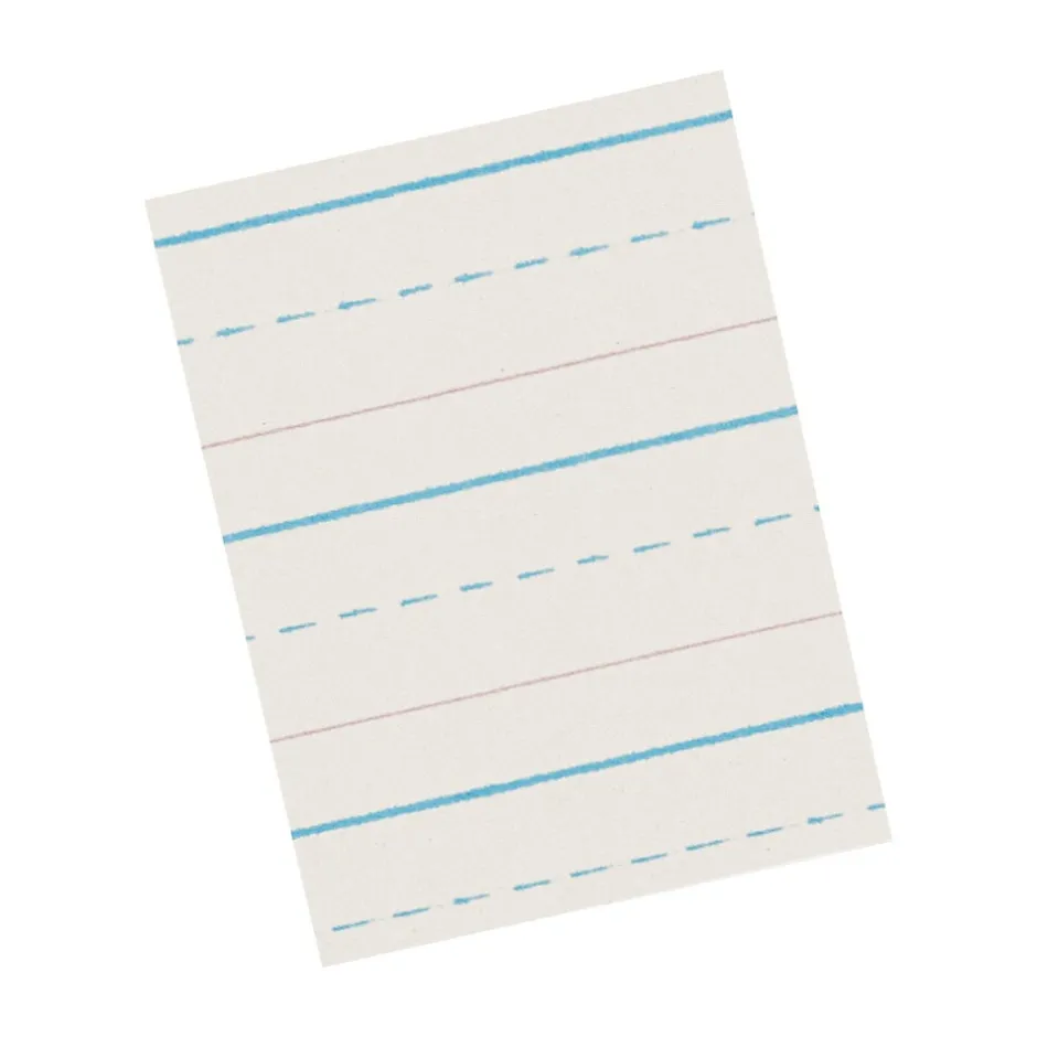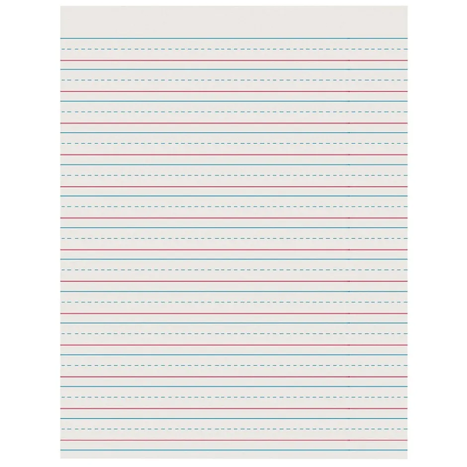 - 1/2″ ruled on both sides with 1/4″ blue dotted midline, red baseline and 1/4″ skip space