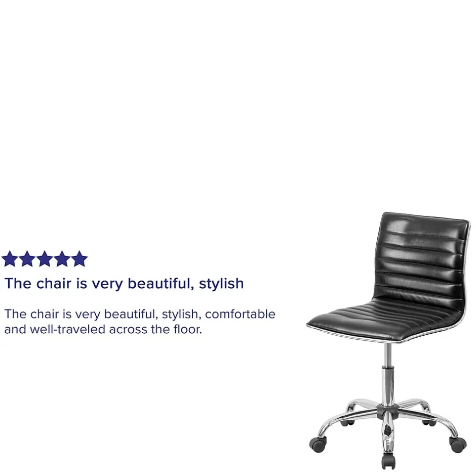 Modern accents and a sleek profile make this ribbed office task chair a perfect addition to your office. A streamlined silhouette combined with the armless design can breathe new life into a small workspace and not only allows room for more board members, clients or visitors but also permits you to roll further under a desk or table. The glossy black vinyl upholstery with a chrome metal border paired with a matching chrome frame and base gives an up-market feel to any professional space. The low back design and foam molded seat and back provide lower back support. A pneumatic seat height adjustment lever lets you easily position the chair while the 360° swivel gives you access to all of your work surfaces. This sturdy task chair has a heavy duty, 5-star chrome base with dual-wheel casters. Spills clean up easily with water followed by a dry cloth.
