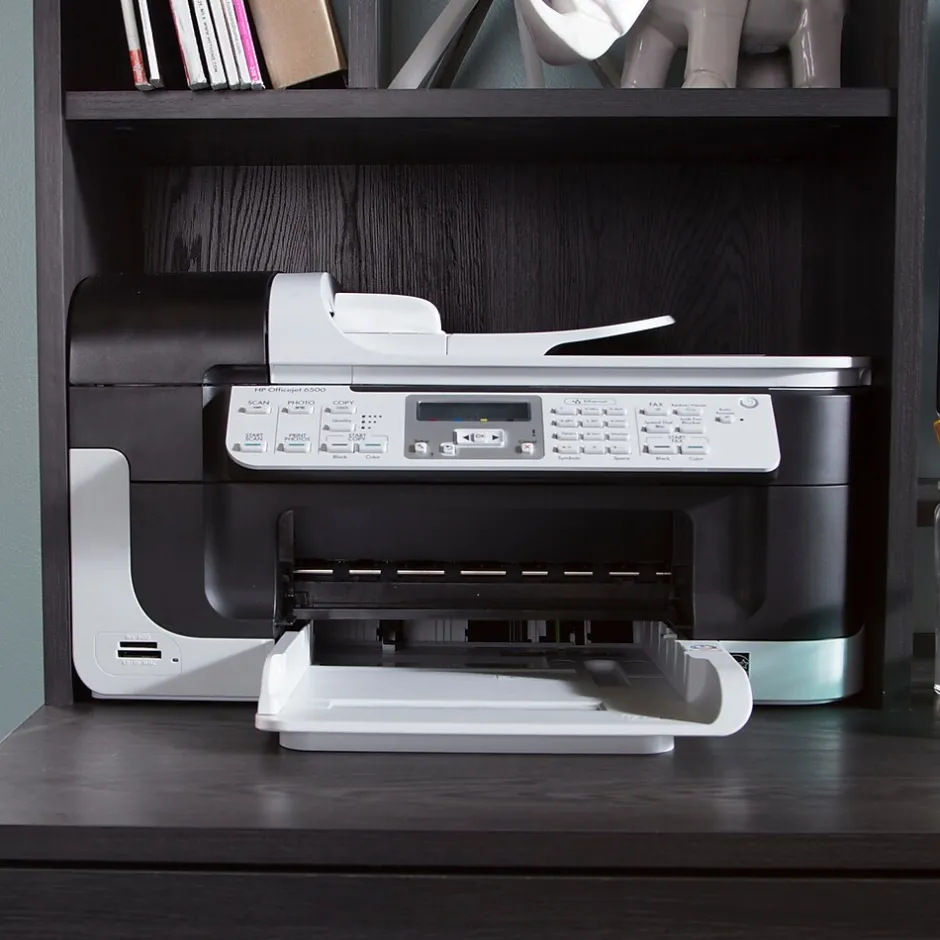- CORD MANAGEMENT: Clear up your work surface by plugging in your laptop, cell phone, and printer directly behind the desk. That’s what the open spaces are for!